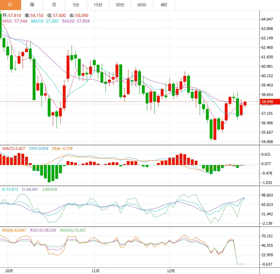 关键价位方面,下方重要支撑位位于 56.80 美元至 56.00 美元区间,若有效跌破,价格可能重新测试年内低点区域。上方初步阻力关注 58.50 美元,进一步强阻力位于 60.00 美元整数关口,该位置同时也是前期密集成交区。RSI 指标在 40 至 50 区间内震荡,未进入超卖区域,显示空头力量有所减弱,但多头动能依然不足。