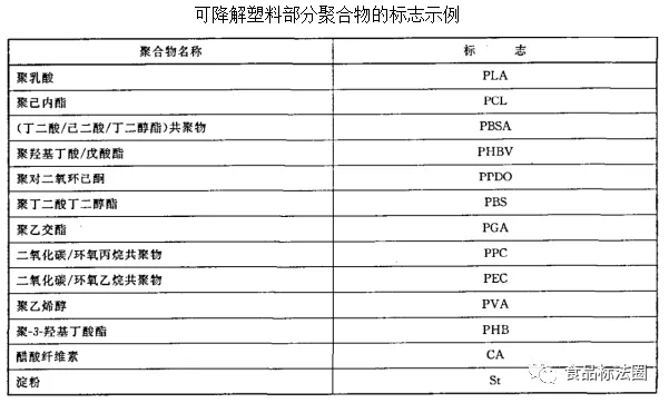 根据GB/T 20197-2006《降解塑料的定义、分类、标识和降解性能要求》的规定,一个合格的降解塑料标识应该包含标准号、降解途径、产品的材质。下图是来自该标准的部分可降解塑料的材质组成标志示例。