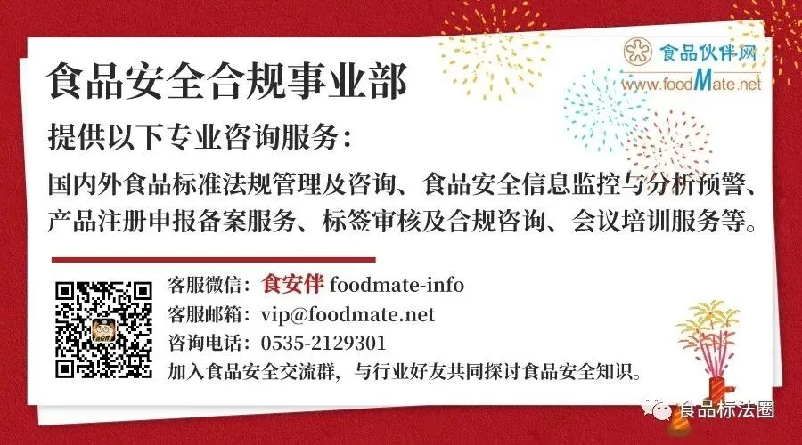 食品伙伴网食品安全合规事业部提供食品进出口合规报告、食品合规监管体系分析服务、产品指标合规分析服务、食品配方合规分析服务、食品安全风险因子研究报告、食品安全判例分析报告、食品抽检/预警数据分析、食品安全舆情监控服务、食品标准法规动态监控跟踪服务、食品标准制修订服务、团体标准制修订服务、出口食品合规咨询服务、出口各国合规咨询等服务,了解更多产品与服务欢迎咨询食安伴(微信:foodmate-info)。