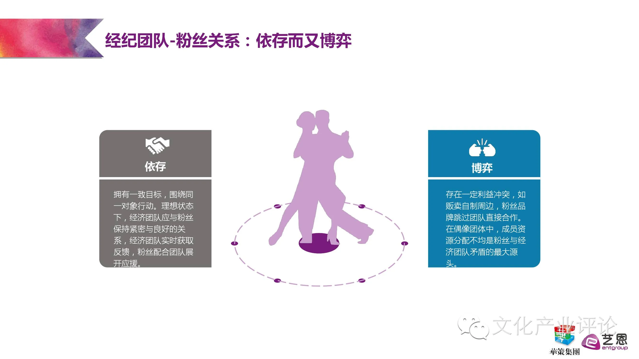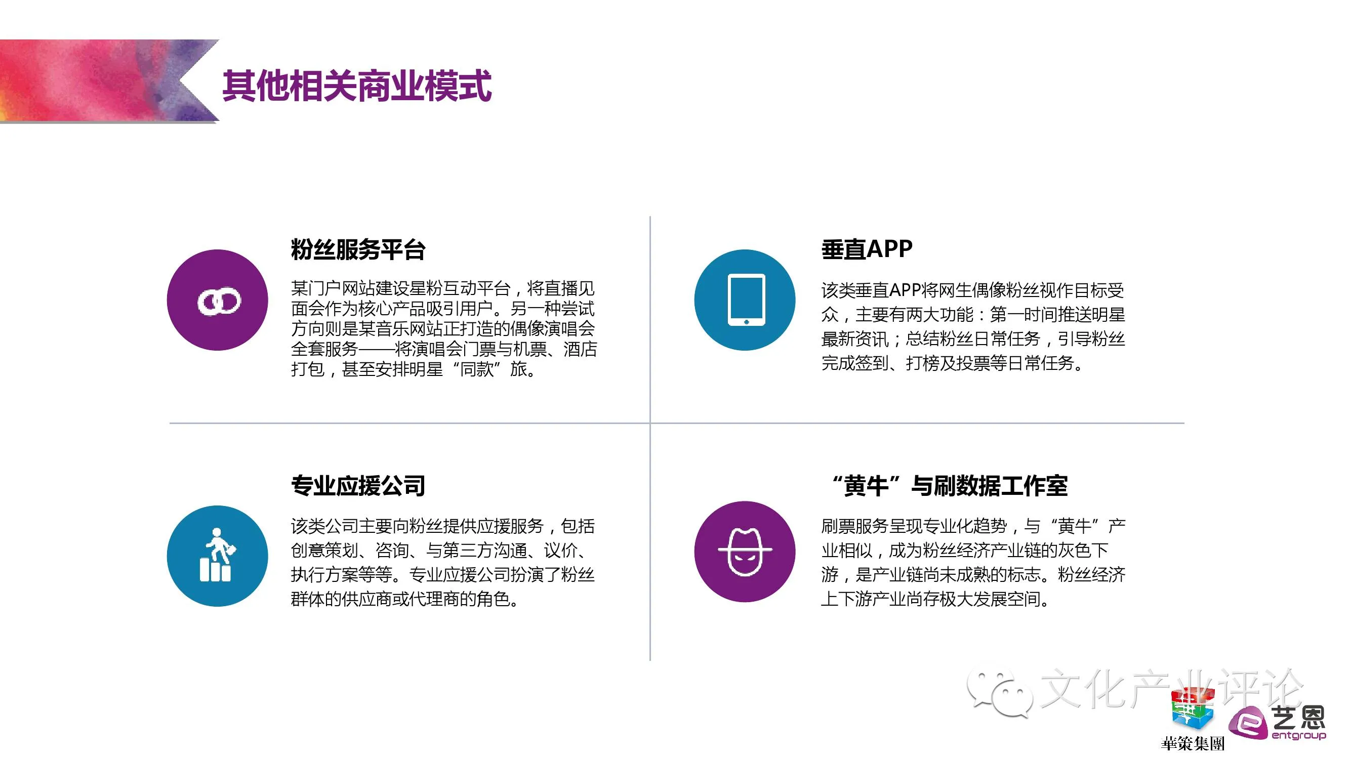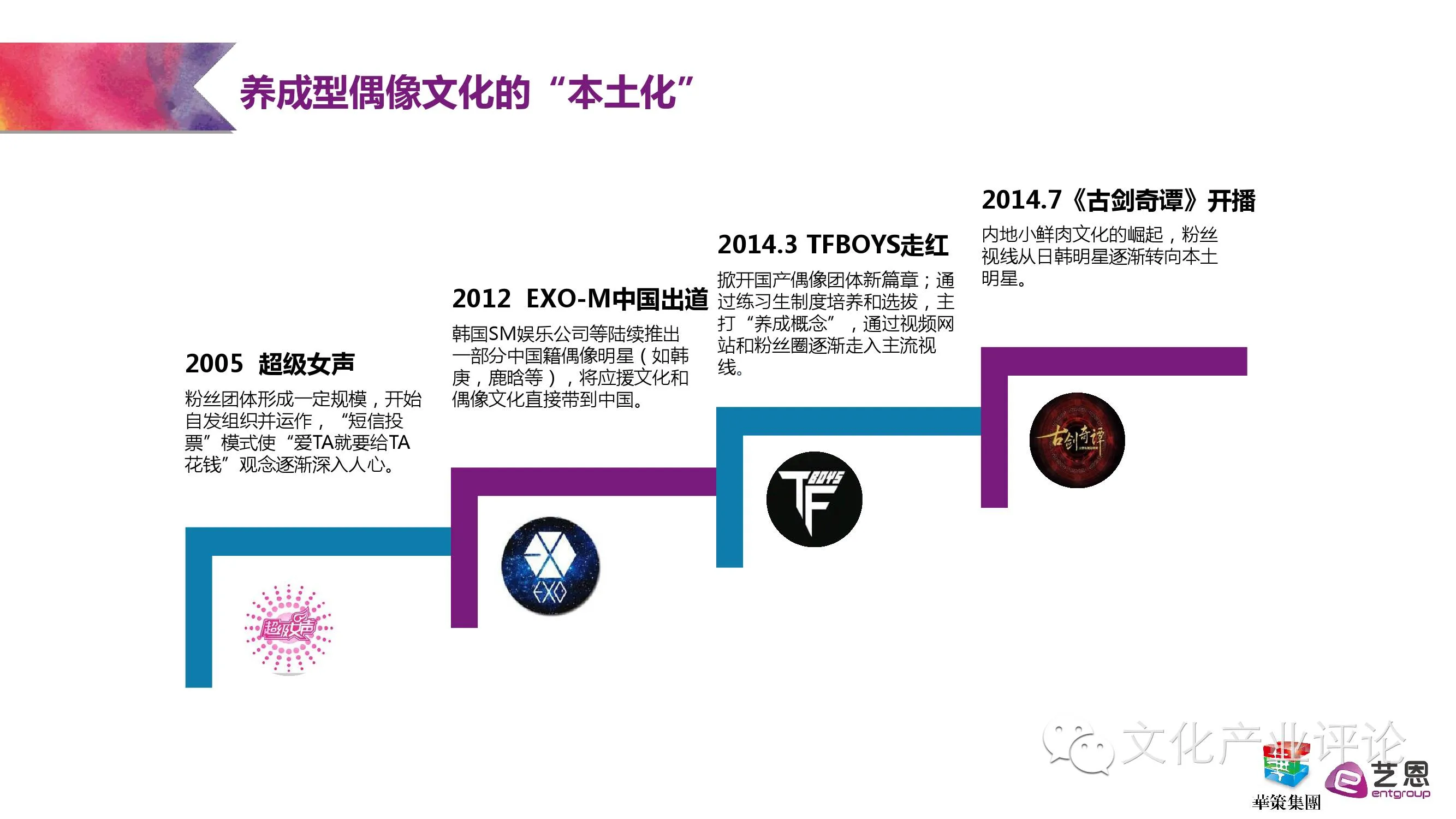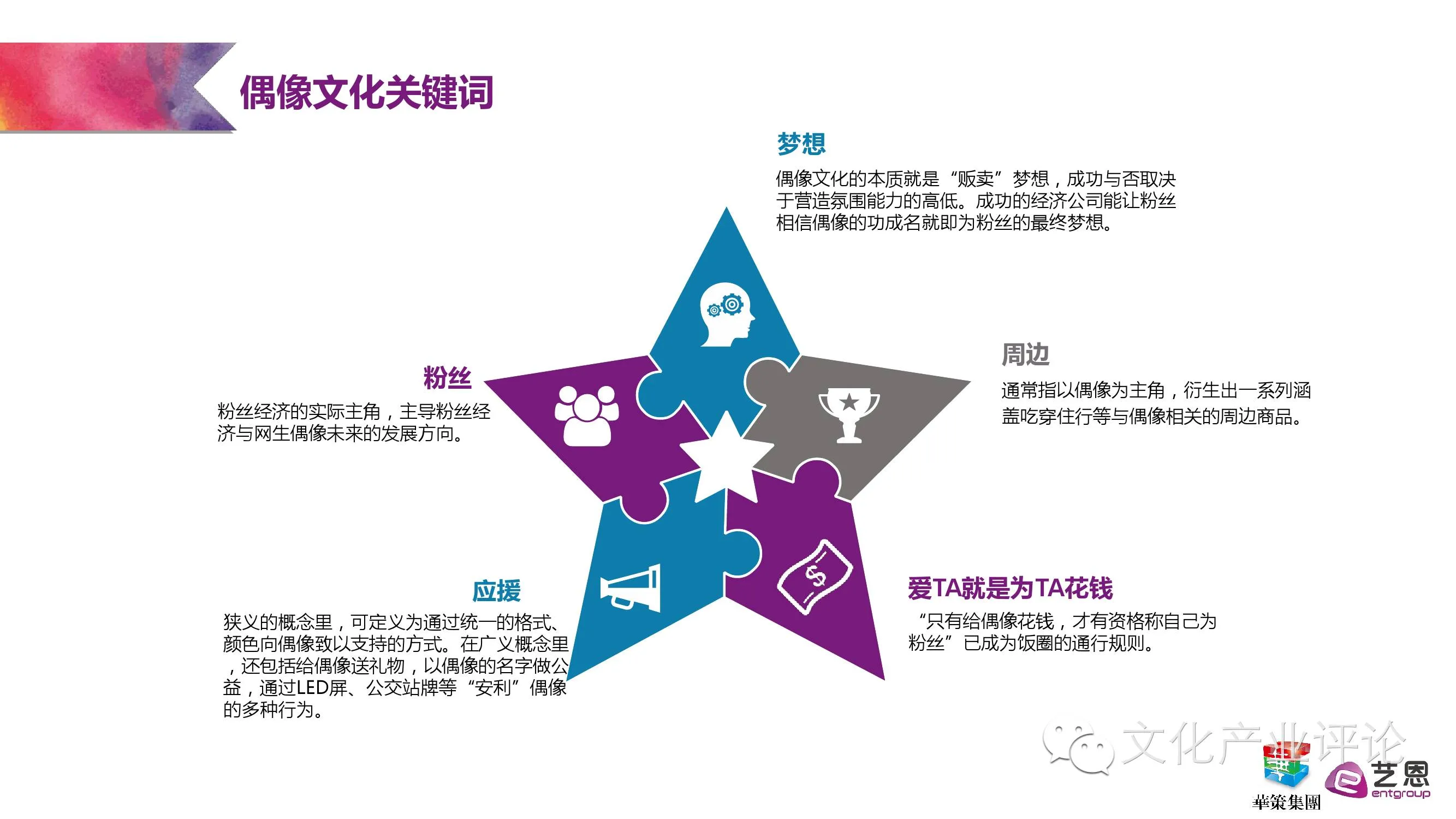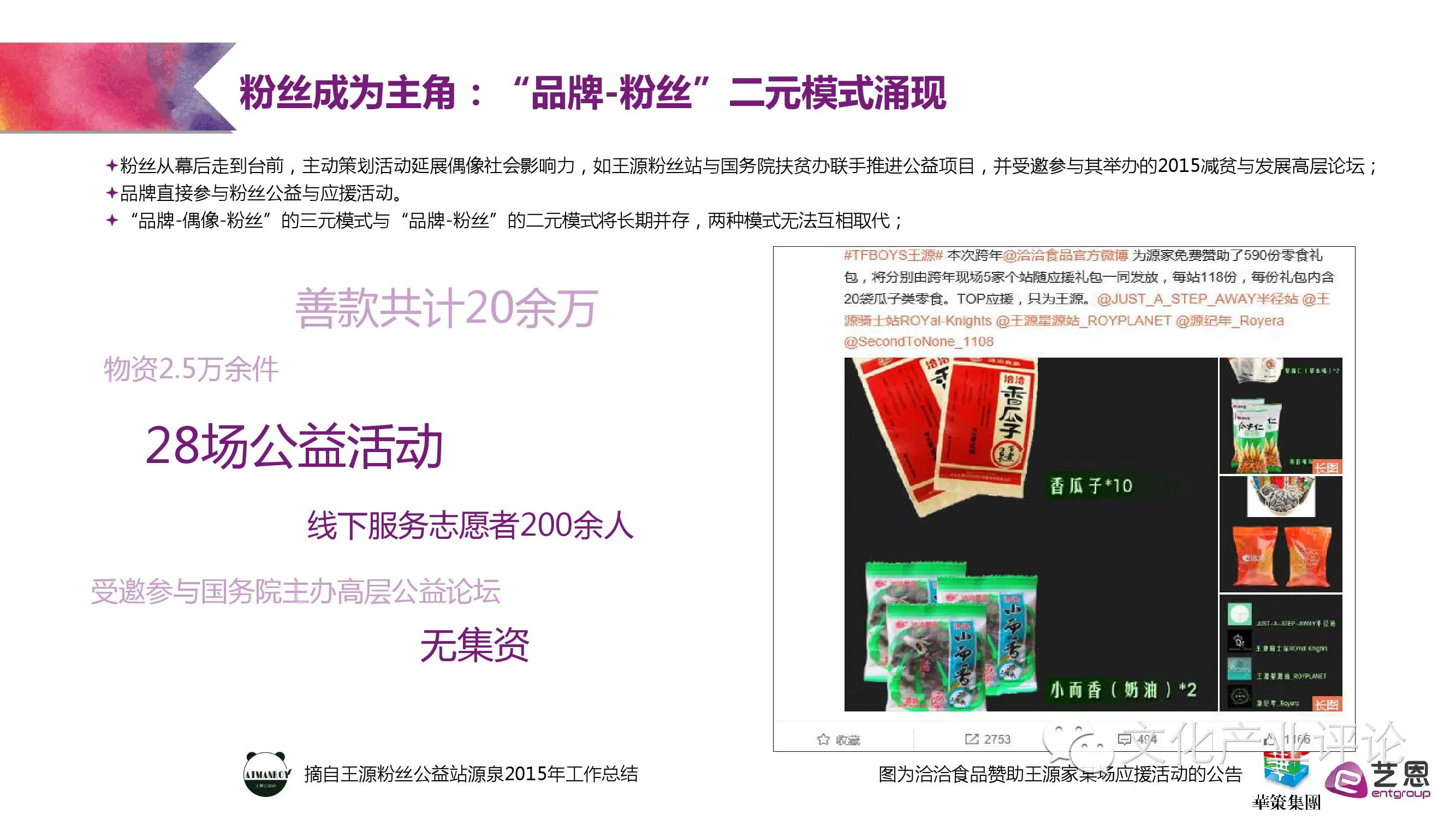 从2005年的《超级女声》引爆网络,到2014年TFBOYS走红和电视剧《古剑奇谭》开播,报告梳理了养成型偶像文化“本土化”尝试的几个重要关键节点,并一针见血地指出,偶像文化的本质即为“贩卖”梦想,成功与否取决于营造氛围能力的高低。而随着散点化、多中心、有机结合的粉丝组织的日渐兴起与成规模化,粉丝的影响力也日益壮大,拥有越来越多的话语权。报告指出,如今不少品牌不通过偶像代言,而直接赞助粉丝应援活动的全新“品牌-粉丝”二元模式开始涌现。甚至明星的经济团队与粉丝的关系也若即若离,处于既依存又博弈的状态。