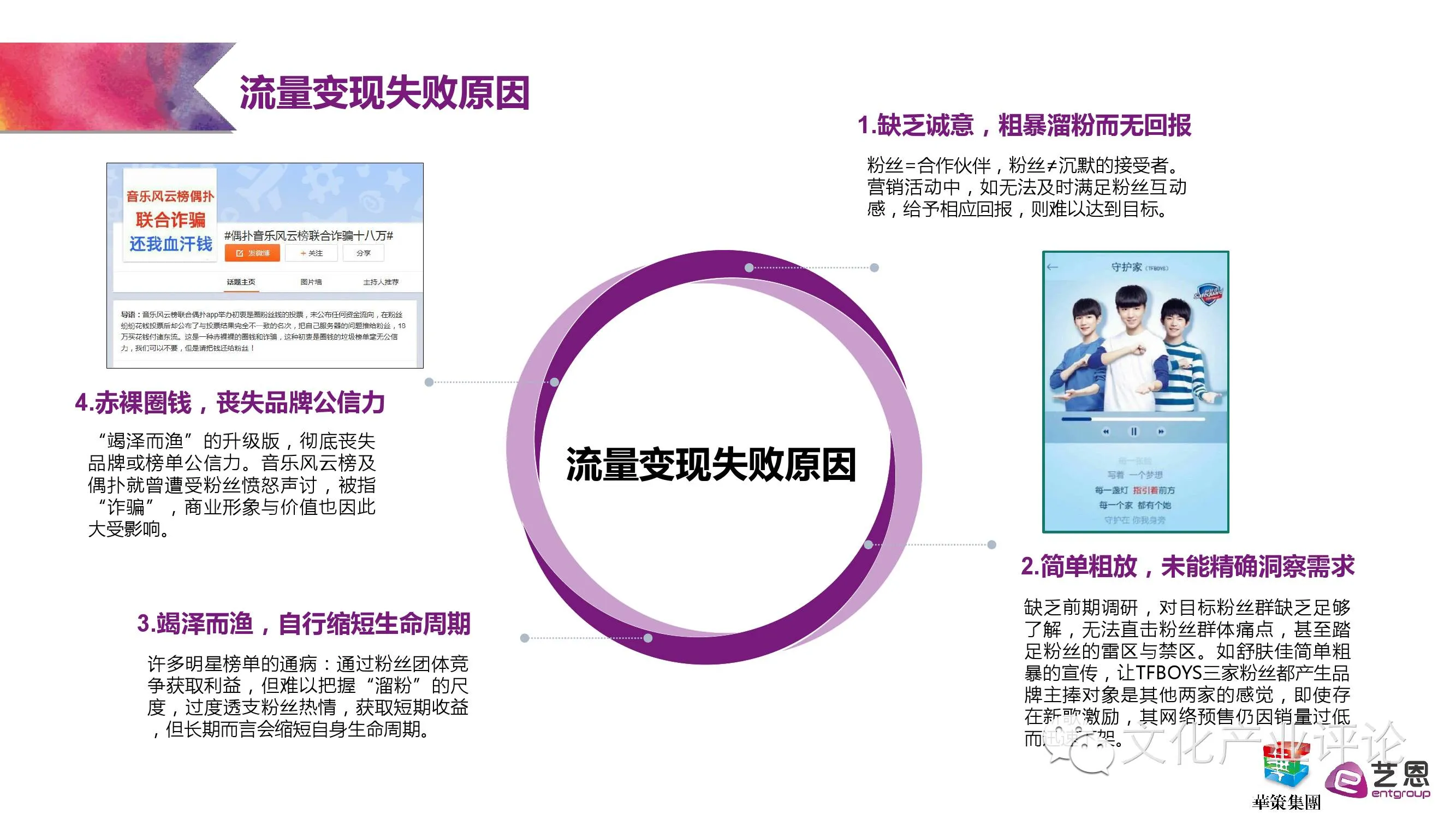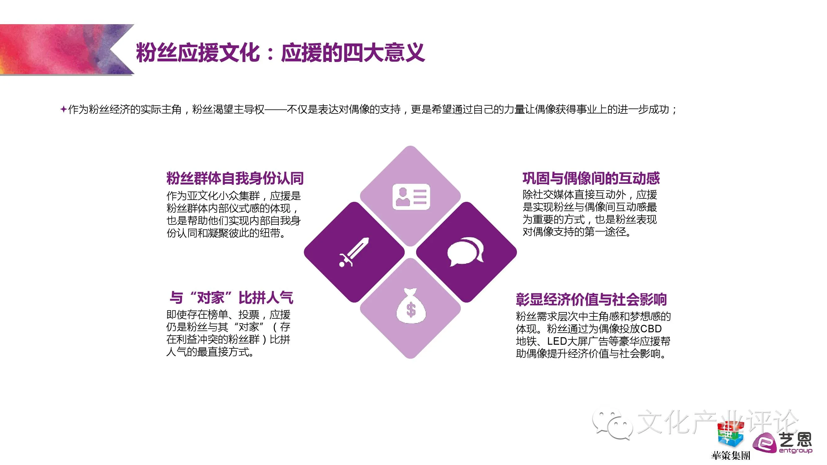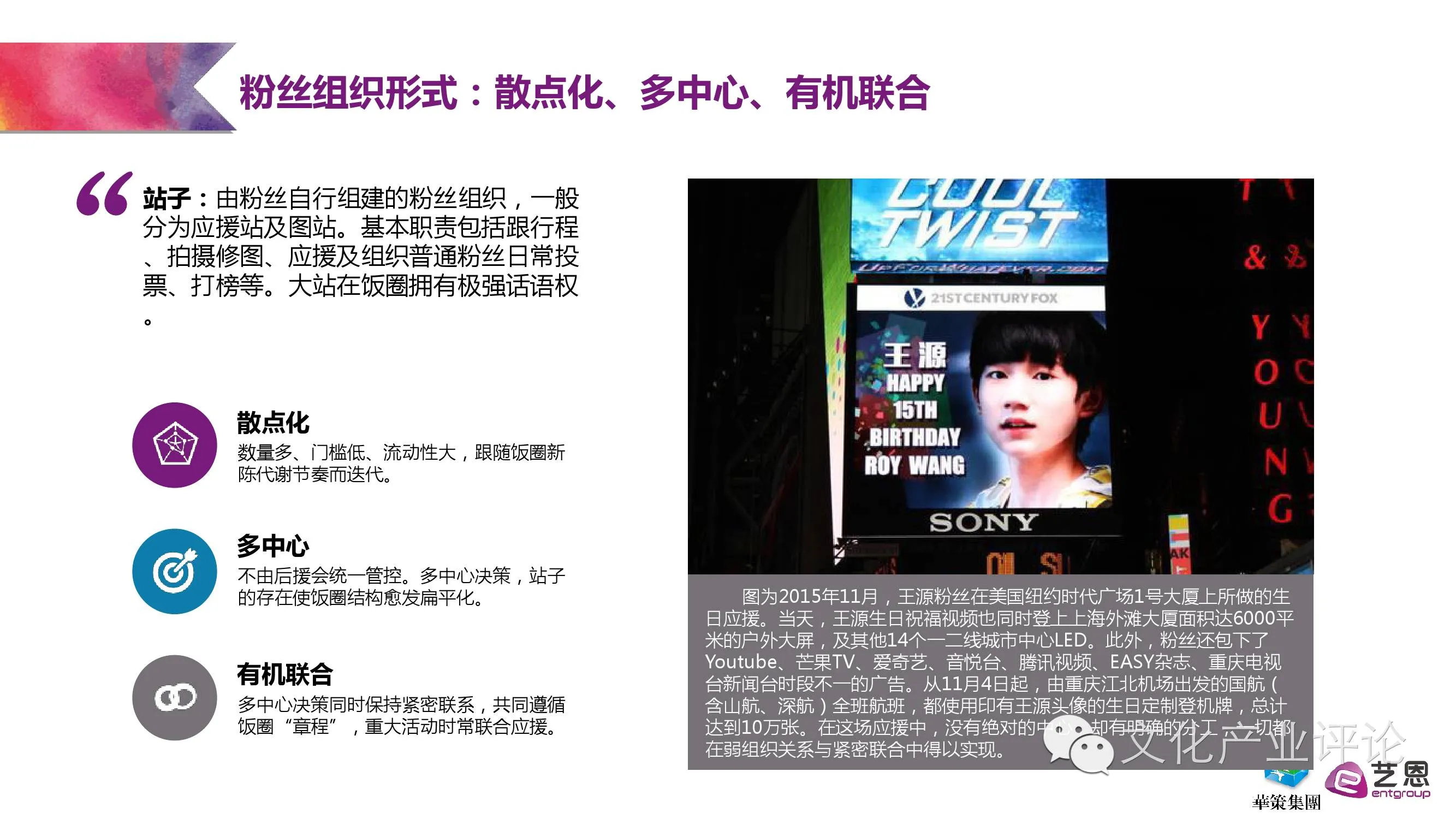 2016年,在“互联网+”热潮的推波助澜下,网生文化发展正呈现出势不可挡的趋势,植根其上的粉丝经济同样市场空间巨大。为了更好洞察粉丝经济发展趋势,经过历时数月对粉丝组织的深度调研,由艺恩携手华策影视联合发布的《我愿为影,护你为王——粉丝经济研究报告》正式出炉,以期从行业角度对当下的粉丝经济进行一番客观梳理与研究分析。