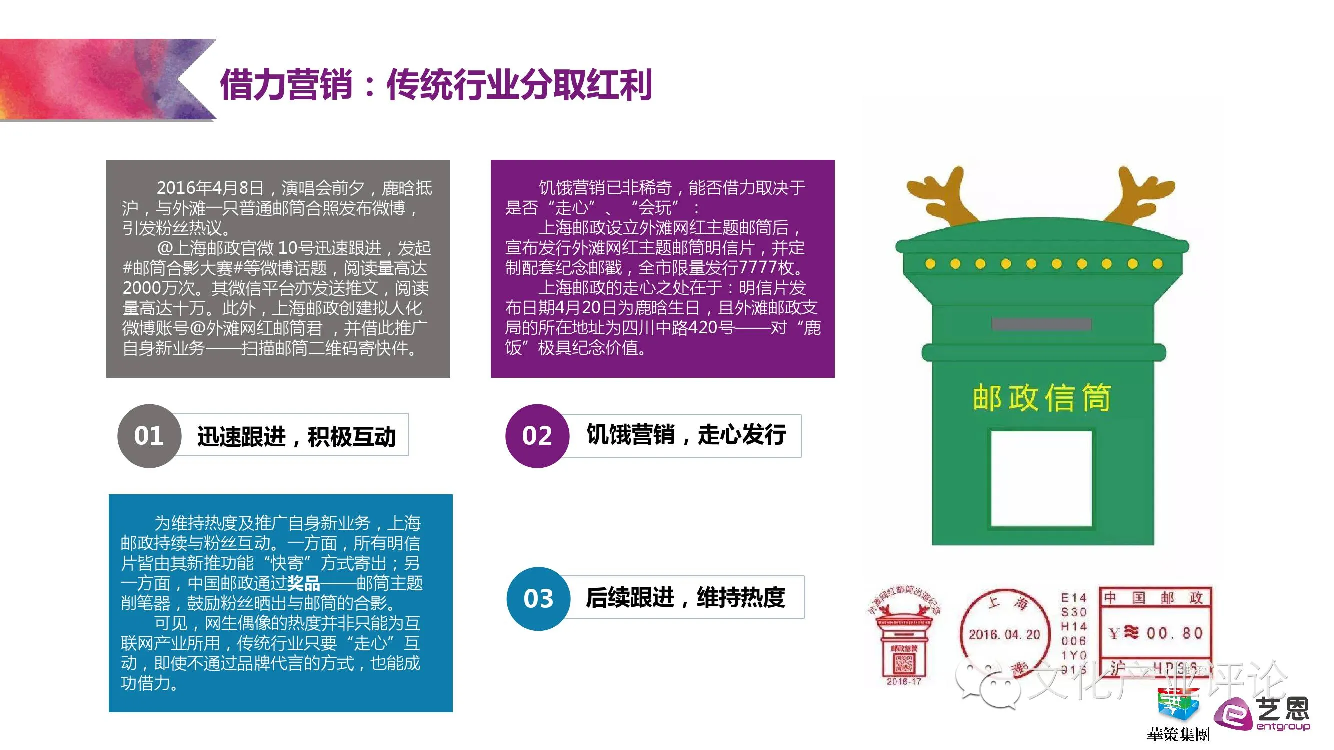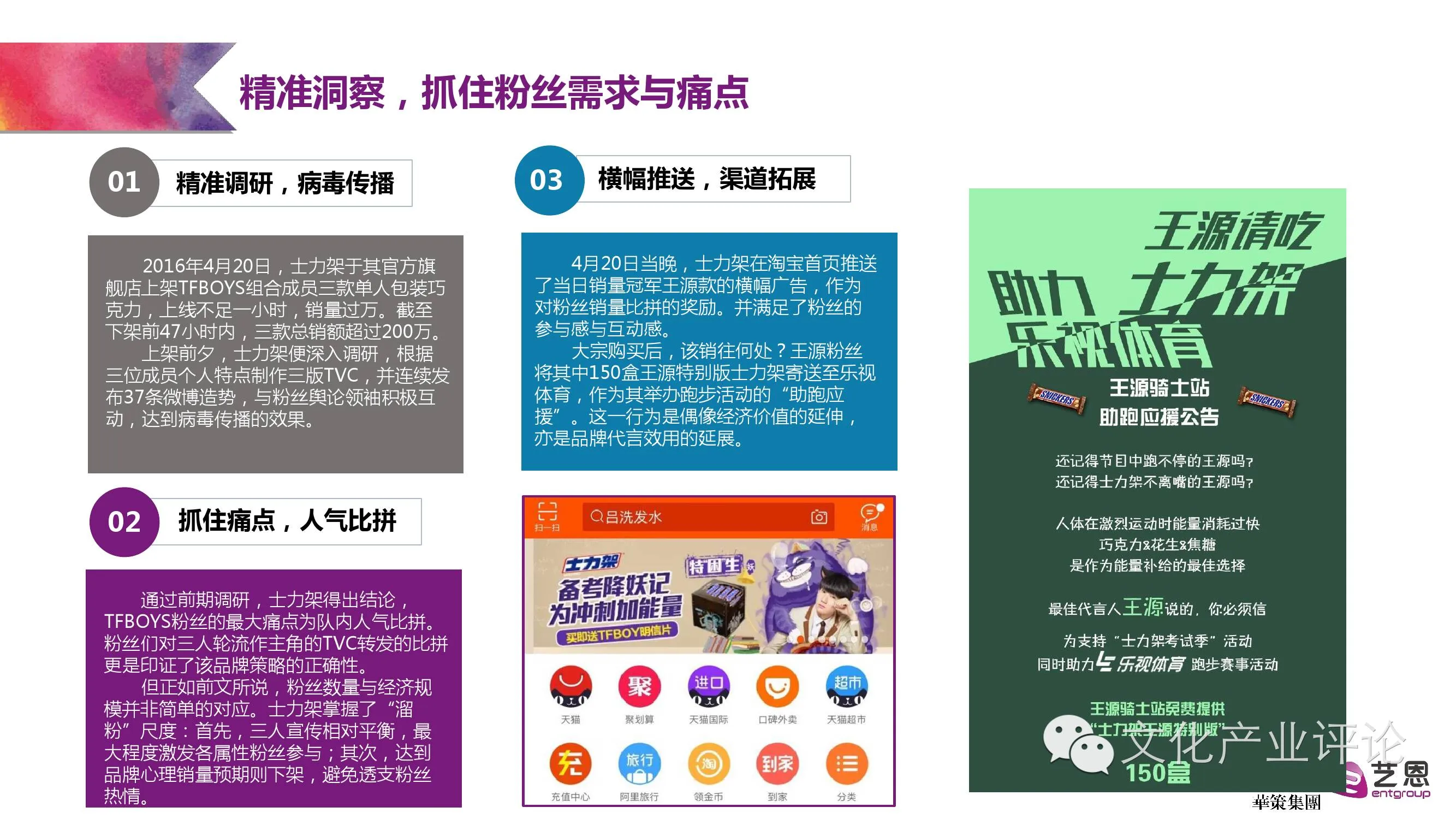 除了来自大数据的精准分析,本次报告也列举出粉丝经济的代表个案加以具体分析。如以杨洋粉丝为其进行电视剧《微微一笑很倾城》剧组应援为例,阐述了当下粉丝如何通过“产出”“安利”的行为,通过主动积极的剧组应援,帮助偶像进行社会关系建设,让剧集未播先热,将偶像参演作品的影响力从小圈层扩散至大众文化。以粉丝通过在舆论制造声量为电影《小时代》营销造势为例,揭示了粉丝如何进行舆论控场,跨平台、跨渠道、跨业态地助力影视作品口碑营销,让《小时代》四部曲票房累计达到17.19亿元的傲人成绩。通过调研可以发现,业界成功的粉丝经济案例,或是精准洞察,抓住粉丝的需求与痛点;或是借力营销,让传统行业从中分取红利。