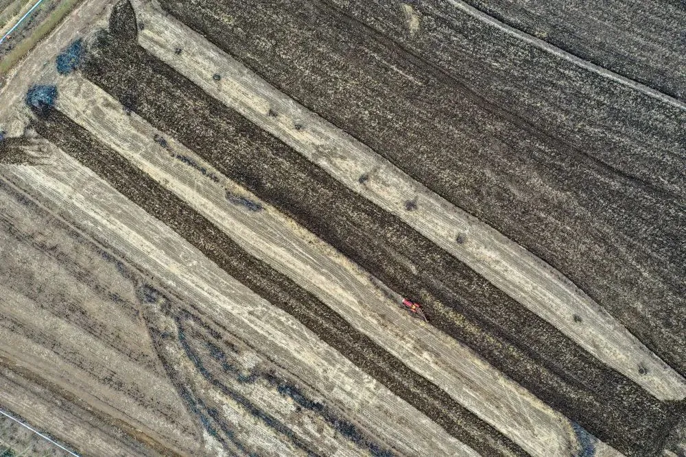在吉林省吉林市昌邑区孤店子镇红卫村,春新生态家庭农场农民驾驶农机耕地(4月26日摄,无人机照片)。新华社记者 张楠 摄
