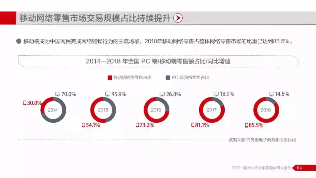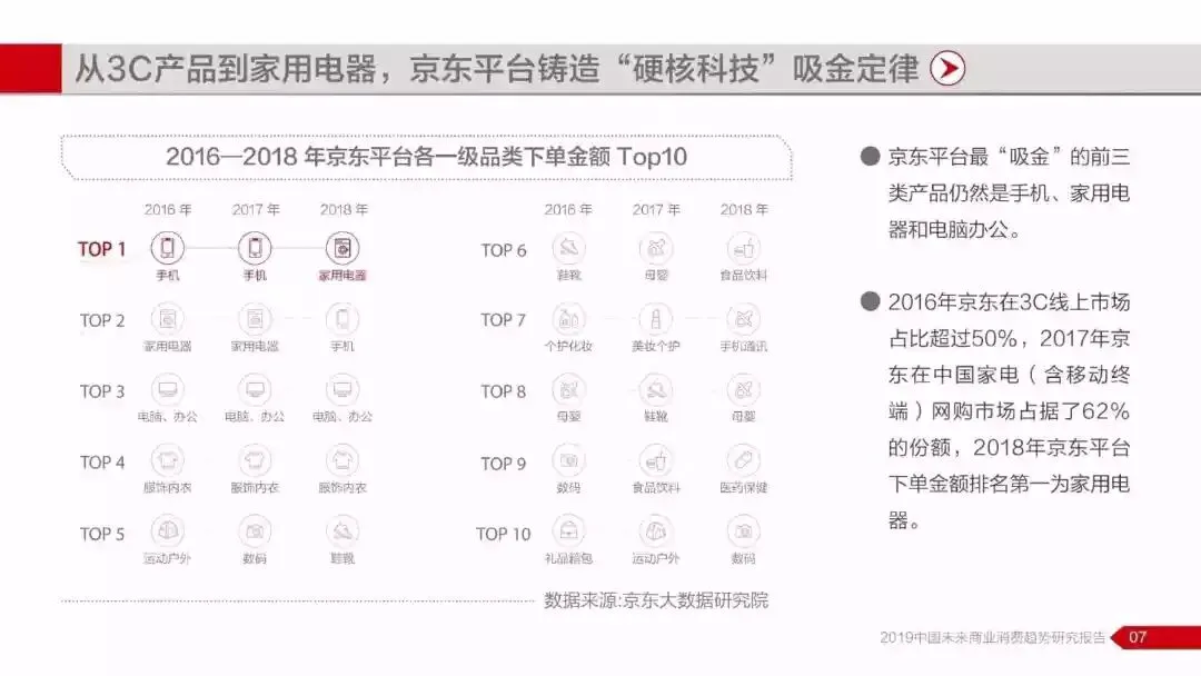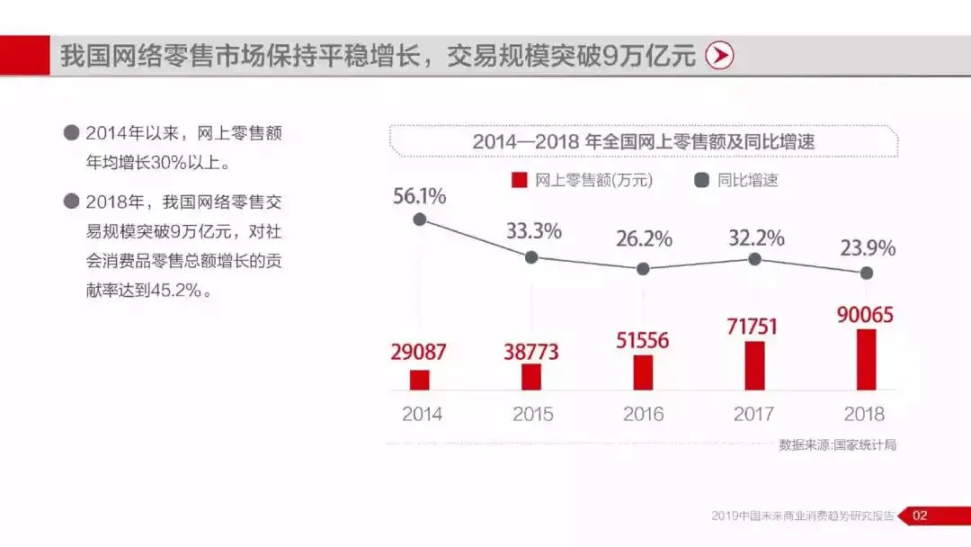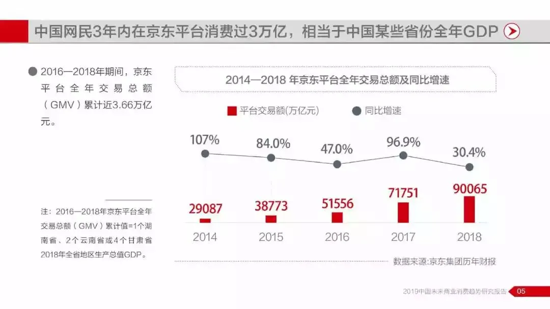 报告显示,2014年至2018年期间中国互联网商业历经快速发展,全国网络零售市场保持平稳增长,并在2018年交易规模突破9万亿元,同时网络零售对全国消费市场拉动作用持续增强,对社消零总额增长贡献率一度维持在30%以上。网络购物已成为国民生活不可缺少的一部分,以京东平台为例,2016—2018年期间,京东平台全年交易总额(GMV)累计近3.66万亿元。