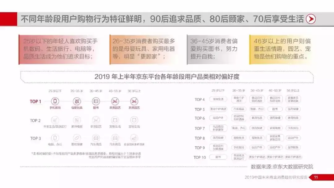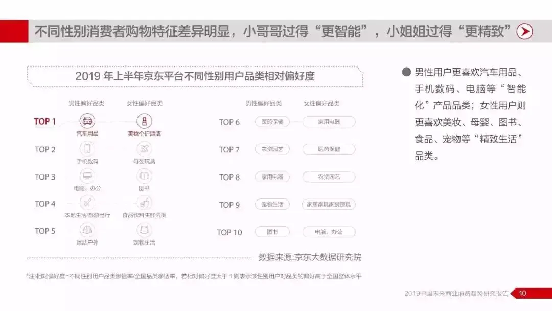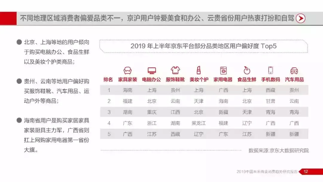 报告同时对中国网购消费者进行了画像分析,发现不同性别消费者购物特征差异明显,男性用户更喜欢汽车用品、手机数码、电脑等“智能化”产品品类;女性用户则更喜欢美妆、母婴、图书、食品、宠物等“精致生活”品类。另外,不同年龄段用户购物行为特征也比较鲜明,90后追求品质、80后顾家、70后享受生活;不同地理区域消费者偏爱品类非常多元,京沪用户钟爱美食和办公、云贵省份用户热衷打扮和自驾,海南省用户是购买家居家具家装厨具主力军,广西省则扛上网购家用电器第一省份大旗。