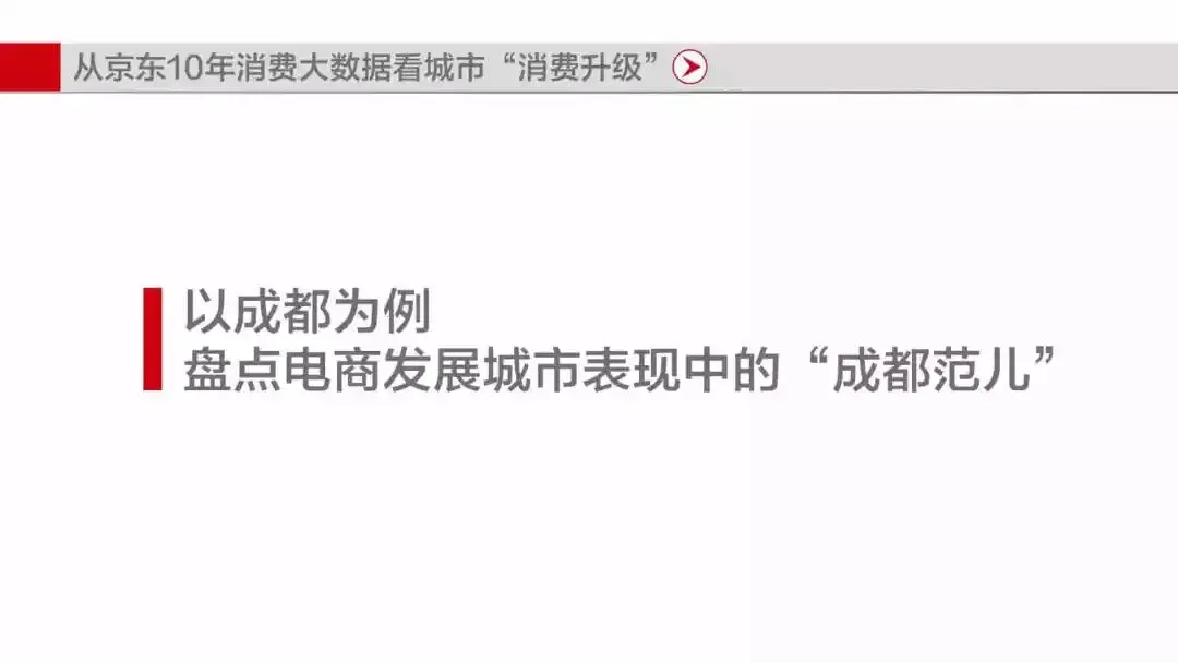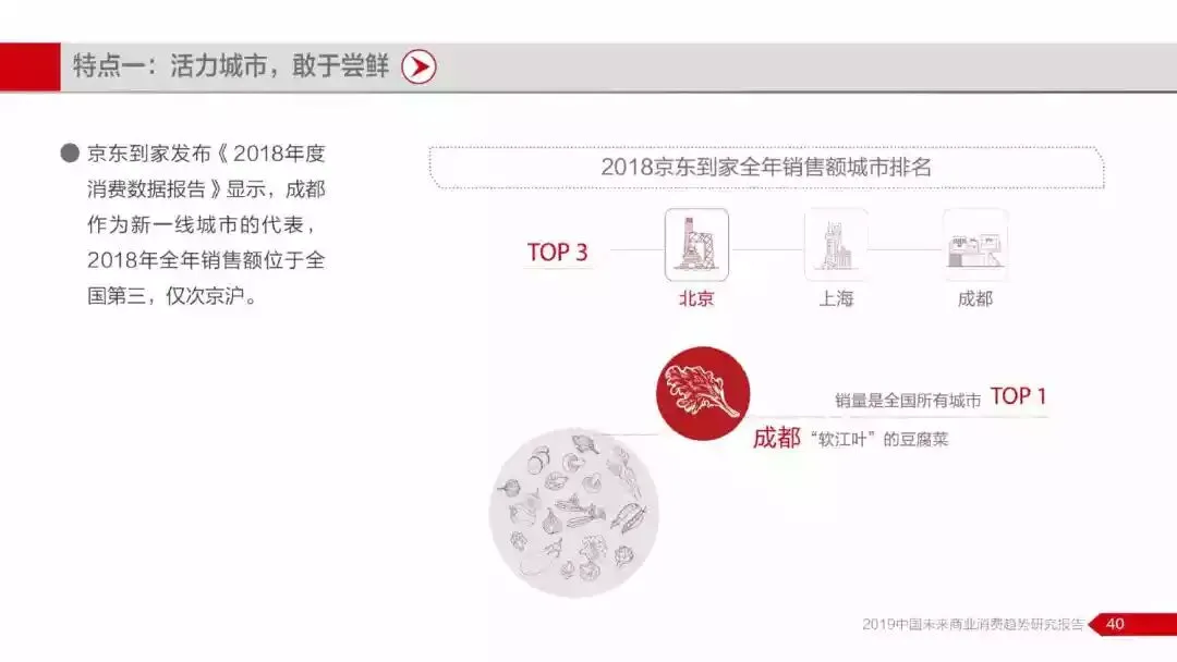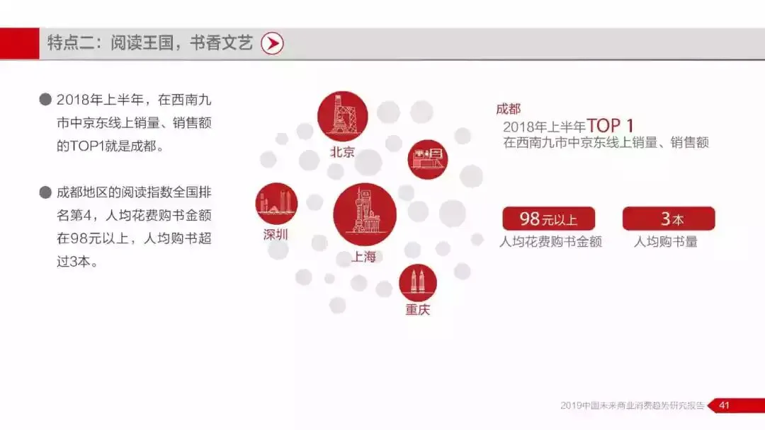同时,报告特别以成都为例,盘点了中国电商发展城市表现中的“成都范儿”,商业活力、阅读文艺、“爸爸顾家”成为成都城市消费关键词。根据在京东到家2018年度消费数据显示,成都作为新一线城市的代表,2018年全年销售额位于全国第三,仅次京沪,而成都人俗称“软江叶”的豆腐菜,销量是全国所有城市的第一名,也只有成都人如此偏爱豆腐菜。与此同时,2018年上半年,在西南九市中京东线上销量、销售额的TOP1就是成都,成都地区的阅读指数全国排名第4,人均花费购书金额在98元以上,人均购书超过了3本。成都在所有城市中的表现还有一个非常有趣的现象,根据京东大数据,在男性用户购买厨具用品的销量Top10城市中,川渝两地的“哥老倌”直接超越了全国所有其他城市的奶爸们,成都奶爸位居全国第二,实力体现了成都汉子的“爸爸力”爆棚。