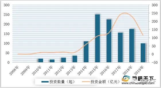 2008-2019年我国餐饮行业投资数量及金额分布情况