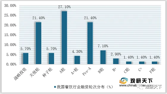 我国餐饮行业从融资轮次分布来看,A轮投资事件最多,占总事件的27.1%;其次是天使轮和Per-A,同时分别占总事件的21.4%。