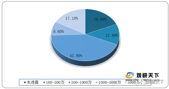 从我行业融资数额分布来看,2019年我国餐饮行业融资数额达到500万~1000万是主流,占据融资数额的42.9%。