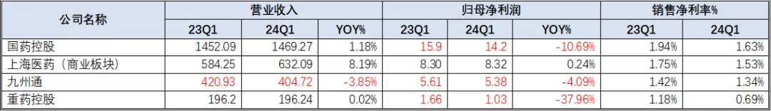 综合一季报数据观察,仅上海医药保持营收、利润双增长态势,与行业龙头国药的差距继续缩小。