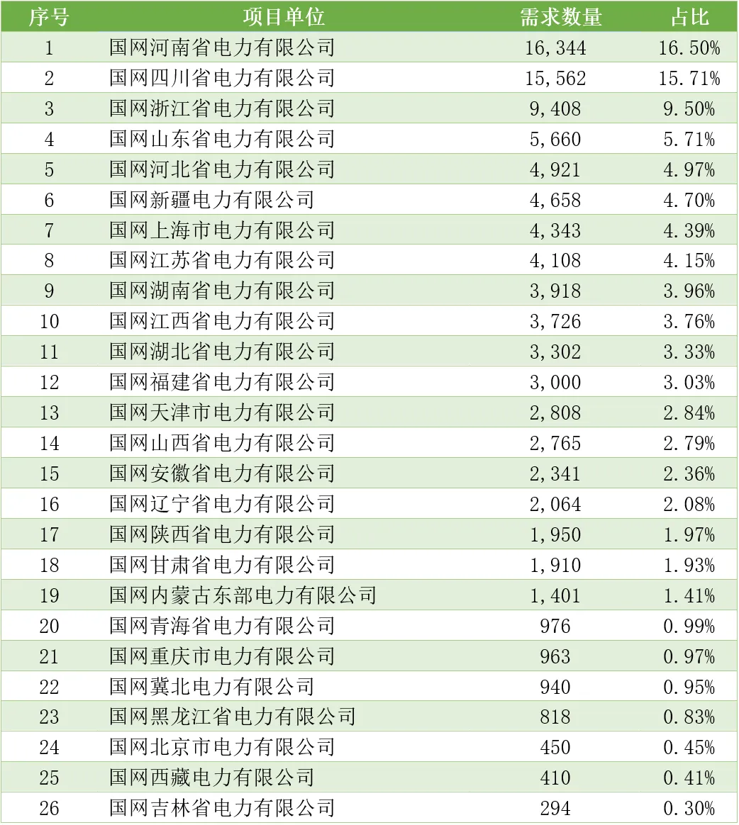 2020年度,99,040台柱上断路器产品来源于26个电力公司(宁夏电力公司未报协议库存需求),需求数量最大的河南电力公司占16.50%。
