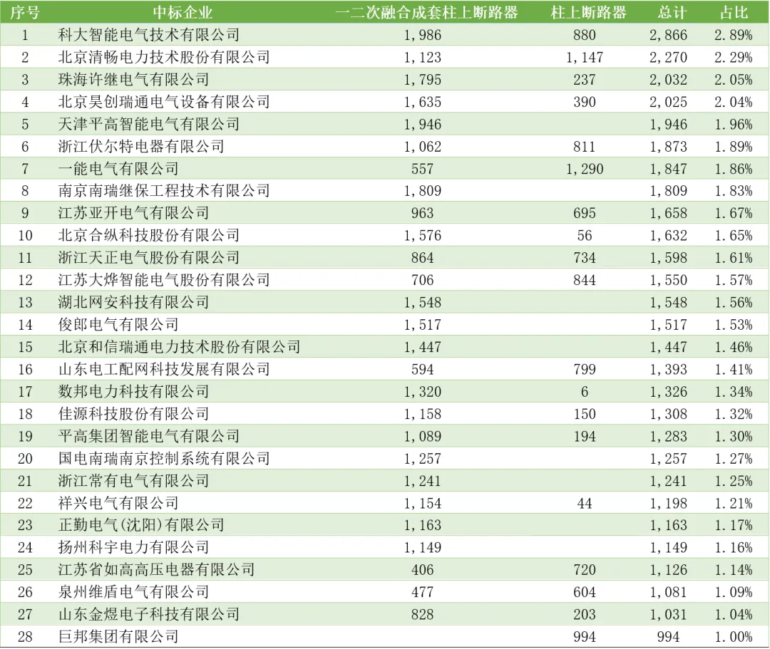 中标的柱上断路器产品形式方面,科大智能电气技术有限公司等42家企业中标全部两种产品形式。
