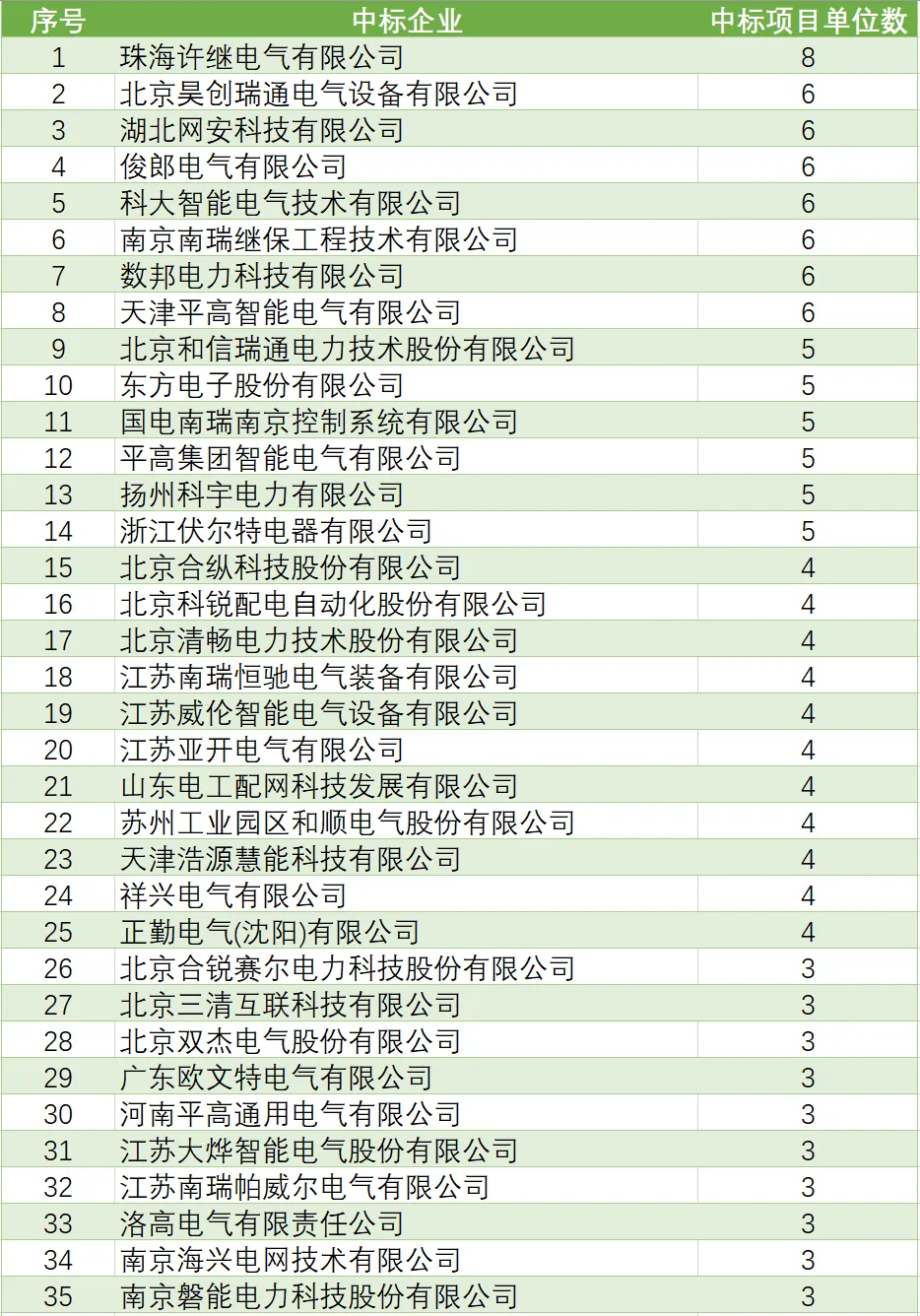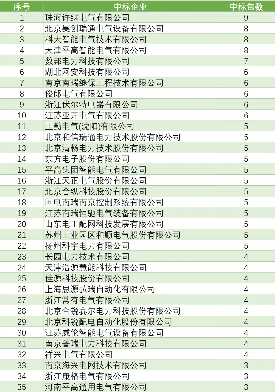 企业中标包数方面,共有88家企业中标2个或以上包数,占中标企业总数的58%。珠海许继电气有限公司中标包数最多,共9个包。