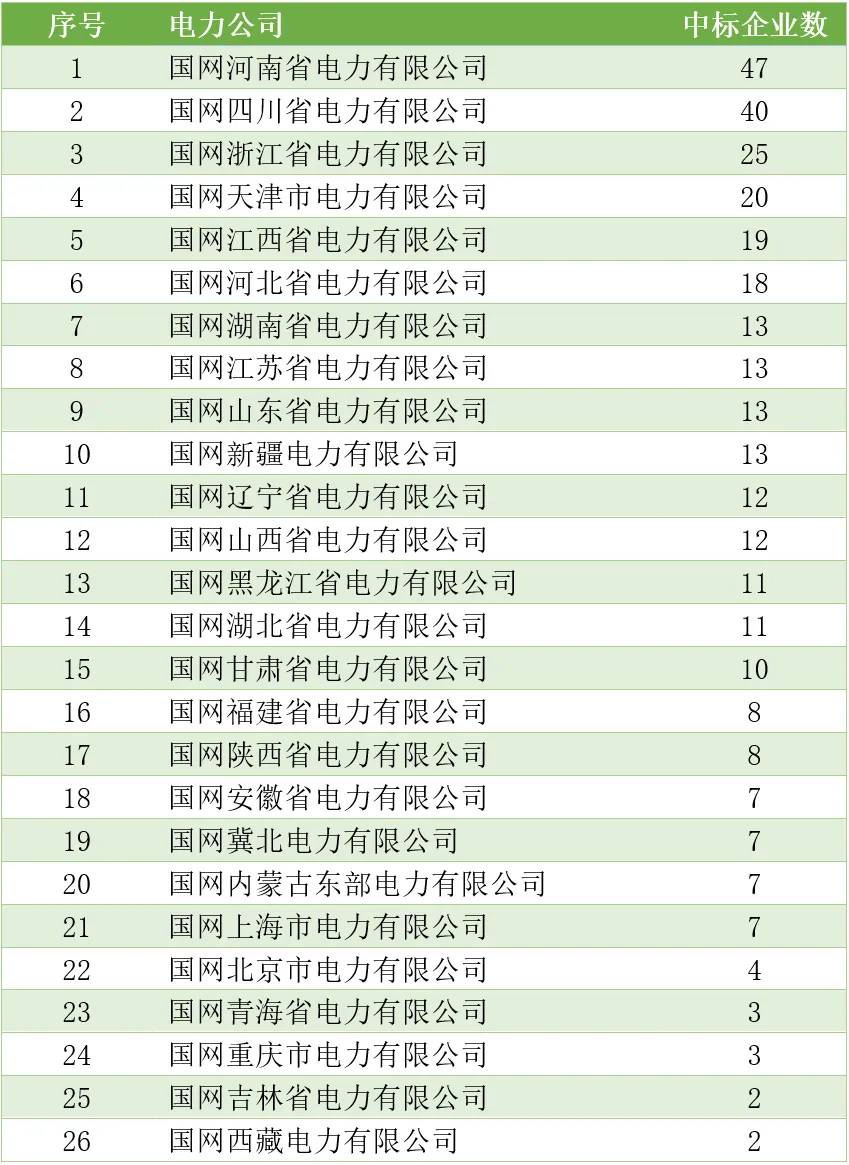 各电力公司中标企业数量方面,在河南电力公司共有47家企业中标,超过10家企业中标的电力公司共有15个。