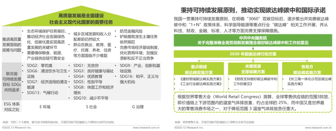 ESG 虽是“舶来品”,其理念内核与中国的高质量发展观高度契合、内在相通,因此 ESG 也得到了中国政府、监管机构和资本市场的高度重视。中国经济正处于从高速增长向高质量发展转变的结构化转型的关键期,生态环境保护、收入分配差距扩大等一系列环境、社会和经济问题逐步凸显。在国家“双碳”目标确立后,对于价值链上下游范围内温室气体排放“大户”的商贸零售行业而言,企业全面绿色转型的诉求尤为紧迫。