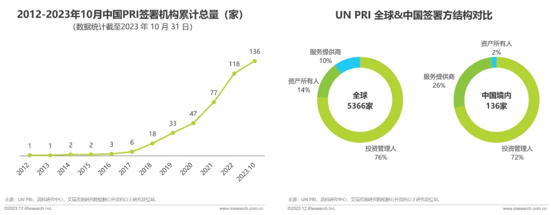 近三年国内签署 PRI 的机构数量加快增长。由于中国总体 ESG 生态环境还比较稚嫩,可持续投资的市场成熟度不高,资产所有者的 ESG 观念总体欠缺,监管未对资产所有者提出严格、强制的 ESG 要求,因此中国 PRI 签署方中资产所有者的比例低于国际平均水平。随着 ESG 相关服务提供商在 ESG 管理的能力支持、价值倡导上不断发挥作用,未来国内 ESG 市场有望实现监管机构与市场参与主体的相辅相成,共同促进资产所有者在资金源头就注入 ESG 价值。