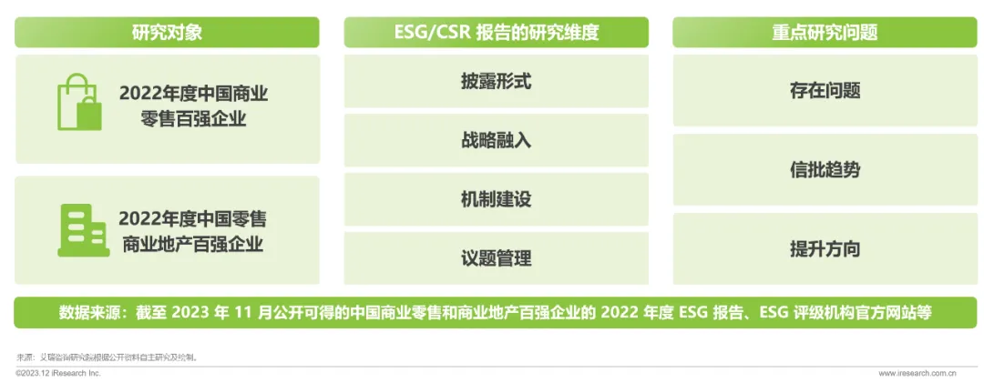 本研究基于公开信息,包括企业独立披露的2022年度 ESG/CSR 专项报告、ESG 评级机构公开渠道可得的评级信息,从披露形式、战略融入、机制建设、议题管理四个方面,解析商贸零售企业的 ESG/CSR 报告内容,从而反映出目前中国商贸零售企业在 ESG 信息披露上存在的问题、趋势和方向,为深化行业整体 ESG 治理水平、提升商贸零售企业的 ESG 评级提供观察依据。