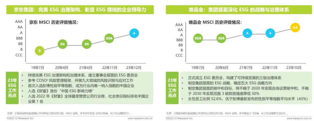 根据国际评级机构 MSCI 的公开评级结果显示,中国零售百强中唯品会、京东和上海豫园的 ESG 表现得到国际认可,均获得较高的评级水平。对标国外头部零售企业如亚马逊,其获得的评级稍逊于国内领先零售企业。注意国内零售百强企业在国际评级机构中,由于业务结构差异,会被归属于不同的行业分类下进行业内比较。