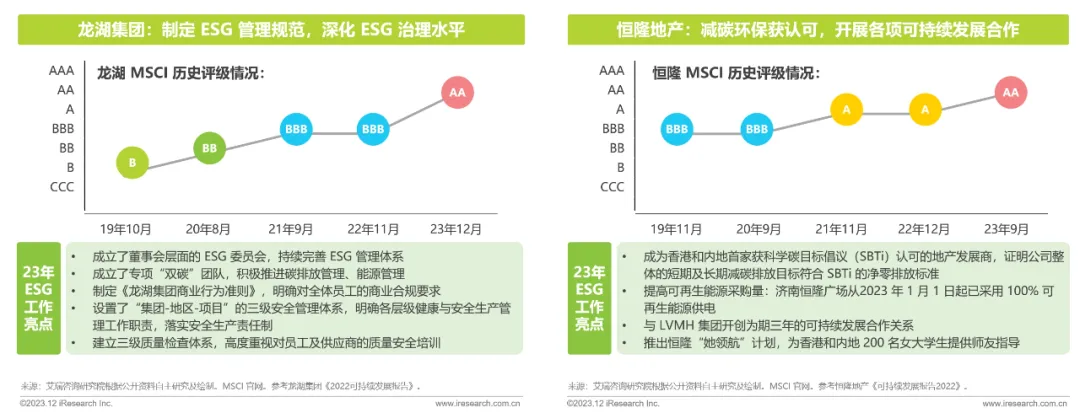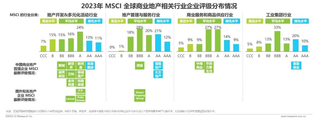 根据国际评级机构 MSCI 的公开评级结果显示,中国商业地产百强中,龙湖、恒隆、太古和复兴商业等企业 ESG 表现得到国际认可,获得领先级评级水平。对标国外相关地产企业,表现同样领先。注意国内商业地产百强企业在国际评级机构中,由于业务结构差异,会被归属于不同的行业分类下进行业内比较。