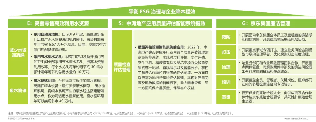 在 ESG 领先的企业看来,ESG 不是监管压力、成本中心,也可以是价值创造的载体。宏观环境的低迷加重了企业经营压力,部分领先的商贸零售企业在推行 ESG 的同时,找到了 ESG 治理与降本增效的平衡点。例如高鑫零售通过自动洗地机等设备革新,实现环境目标和降本;中海地产引入智能化的质量评估系统,提高工作效率的同时满足了保障楼宇质量与消费者健康安全的社会要求;京东推进反腐败管理,在满足治理要求的同时有利于降低成本,为消费者带来更实惠的商品。