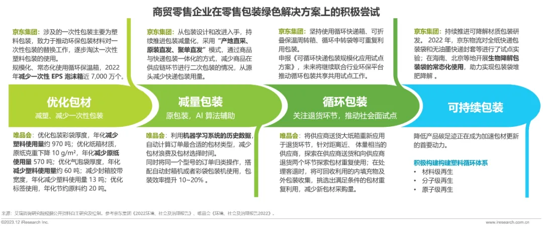 产品包装和碳足迹对于商贸零售企业而言是重要的环境议题。领先的商贸零售企业积极探索绿色解决方案,通过 AI 人工智能、生物科技等技术,或在物料和流程上的创新,实现减塑减量、包装循环再生、包装可降解,加速推进达成减少环境污染的目标。