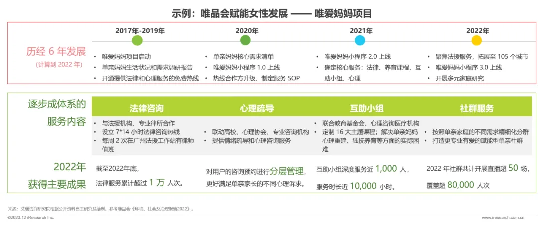 几乎所有商贸零售企业都或多或少参与社会公益活动,但很少企业在社会公益上有明确的整体规划和路线图。加强整体规划,有助于向社会各界体现企业社会贡献的稳定性和专注性。例如唯品会推动的旨在赋能女性发展的唯爱妈妈项目,历经 6 年的发展,从单亲妈妈需求出发,不断深挖需求和迭代服务内容,为单亲妈妈人群带来切实帮助。