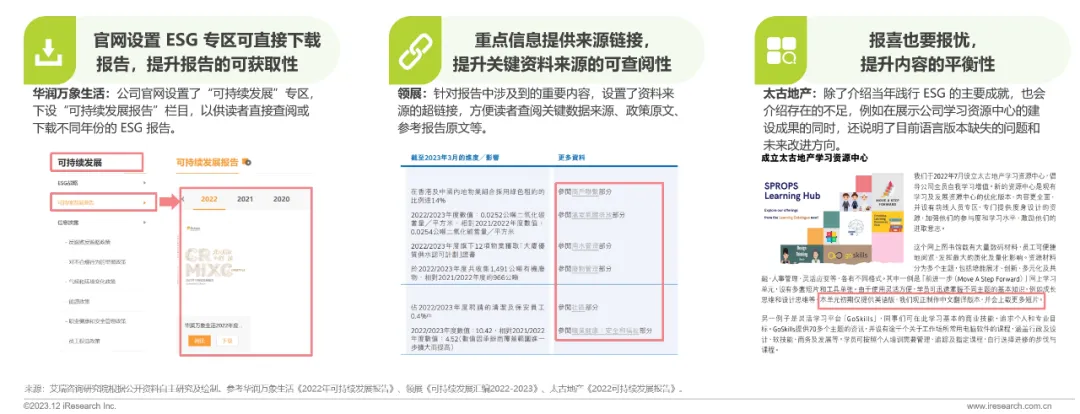 ESG 专项报告的最终目的是把企业内外繁多的 ESG 相关的信息以透明公开的方式向社会各界利益相关者披露,因此透明度是衡量优秀的 ESG 报告的重要标准。目前仍有不少商贸零售企业的 ESG/CSR 专项报告不能直接在官网上下载,影响了报告的可获得性。可以借鉴领先企业的做法,通过增加政策资料的出处、披露 ESG 实践有待提升的事项,来进一步提升报告的信息透明度,增进报告的公信力。