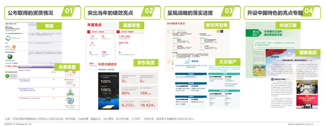 领先的企业除了参考常规的依据编制报告、披露企业在 ESG 的基础信息,也注重通过多种方式,突出企业的亮点实践,引导利益相关者在众多的企业 ESG 信息中,关注成就和进度,增强对企业 ESG 实践成效的感知。具体的方式包括不限于公布取得的资质情况、突出当年的亮点绩效数据、呈现目前战略的落实进度、开设中国特色的亮点专题如乡村振兴和党建。