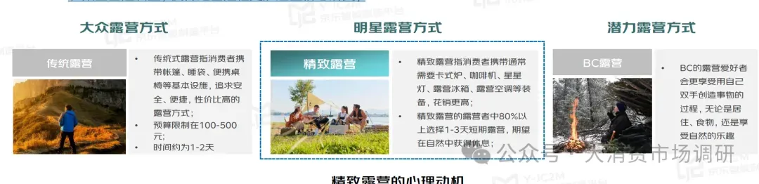 露营分为三种模式,传统式露营、精致露营、BC露营,其中,精致露营的快速崛起,消费者从装备专业向舒适体验和氛围营造转型,使得露营过程更加注重情感消费;