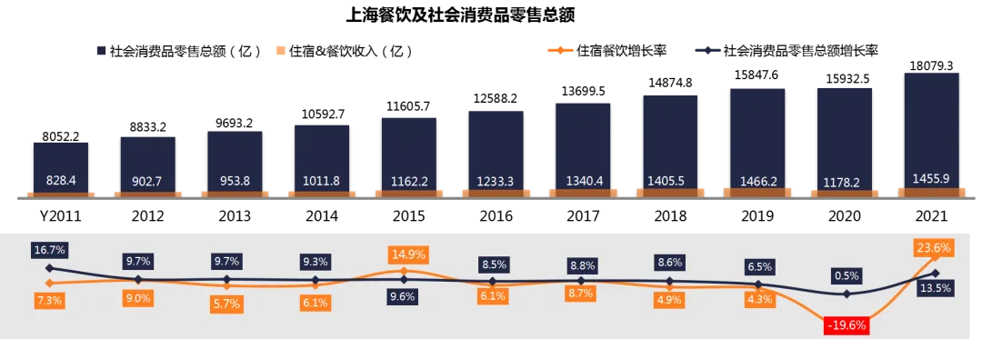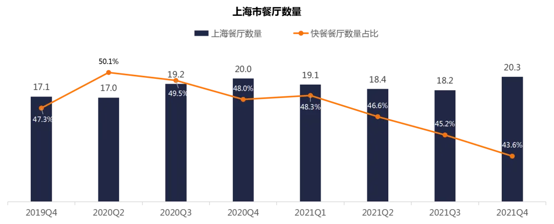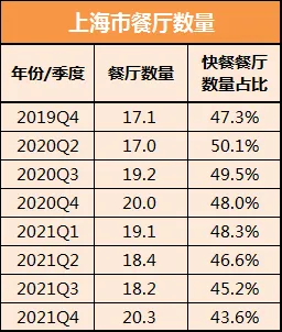 截至2021Q4,上海共有餐厅20.3万家,2年复合增长率9%。