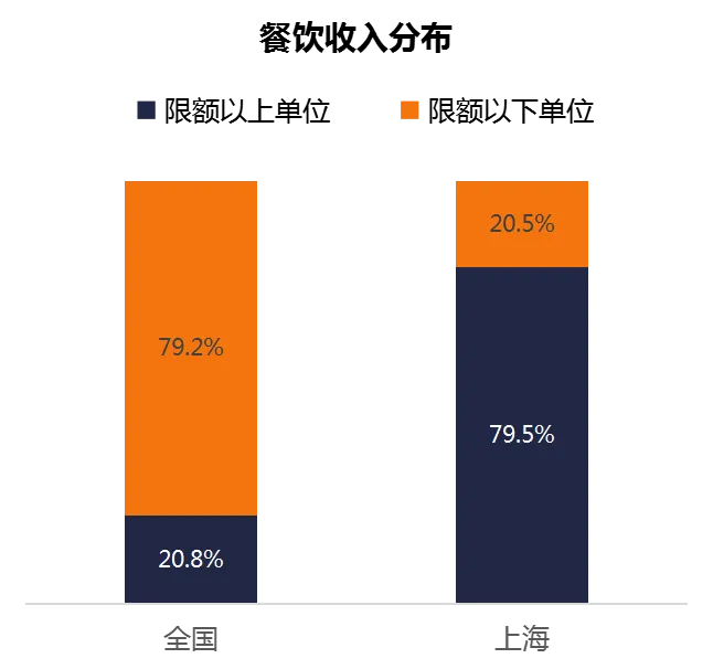 不同于全国餐饮市场,上海餐饮市场收入以限额以上餐饮单位为主,占比79.5%;