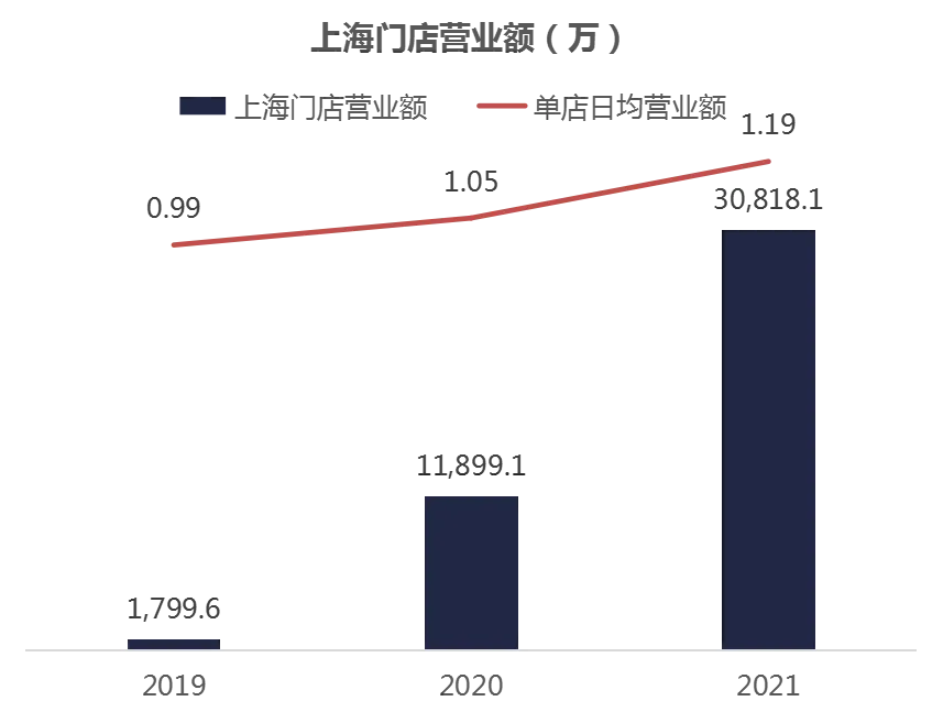 2021年,所有门店营业额3.0亿,单店日均营业1.19万