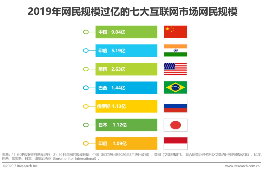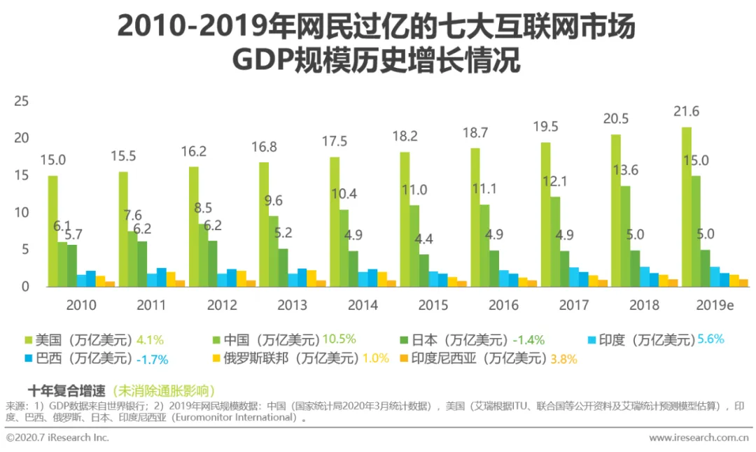 2018年,印度尼西亚的网民数量破亿,至此,全球网民破亿的国家数量升至7个。2019年,中国以9.04亿的网民数量远超其他国家,拥有着全球第一大的网民规模,印度与美国则分别以5.19亿与2.63亿的网民数量位居第二与第三。2010-2019年的十年间,在网络过亿的七个国家中,中国的GDP规模维持在第二位,而期间的年复合增长率为10.5%,与网民数量一样位列第一。除此以外,借助着人口红利以及经济条件的逐步改善,“人口大国”印度在2015年完成了对巴西和俄罗斯GDP的反超,至今稳居第四位。头部网民规模国家GDP的快速增长与大规模,将与网络市场的扩大相辅相成,共同为该国网络经济的发展打下基础。