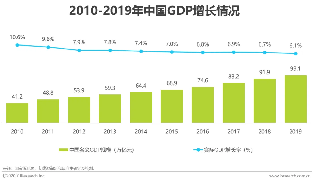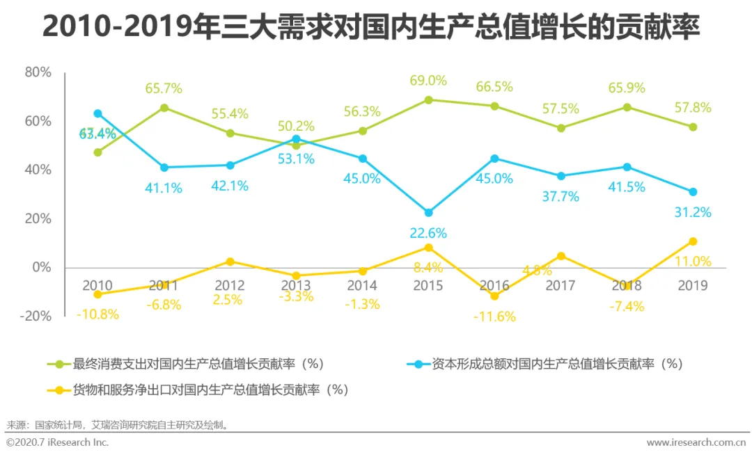 在2010-2019年间,我国GDP以7.7%的年均实际增速快速增长,并于2019年达到99万亿元。从拉动经济发展的“三驾马车”对GDP的贡献来看,传统的以投资为经济发展导向的方式在产能过剩的情况下效益开始降低,而与此同时,人均收入水平加速提升、“新经济”和“消费升级”逐步成为我国社会的发展方向,因而在过去十年中,资本形成总额对GDP的贡献率下降,消费支出以过半的贡献率替代投资成为GDP增长的主要动力。另外,2019年净出口对GDP的贡献达到11.0%,为过去十年中的最大贡献率,这得益于国家“六稳”和“五个优化”政策对国际贸易市场的开拓和布局、商品结构的升级、出口质量的提升等,在国家外贸稳中提质的发展推动下,货物和服务净出口将继续维持对GDP的正向贡献。