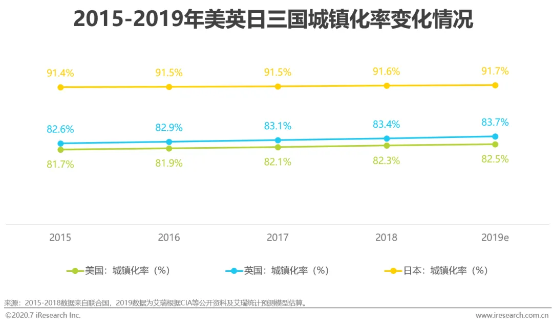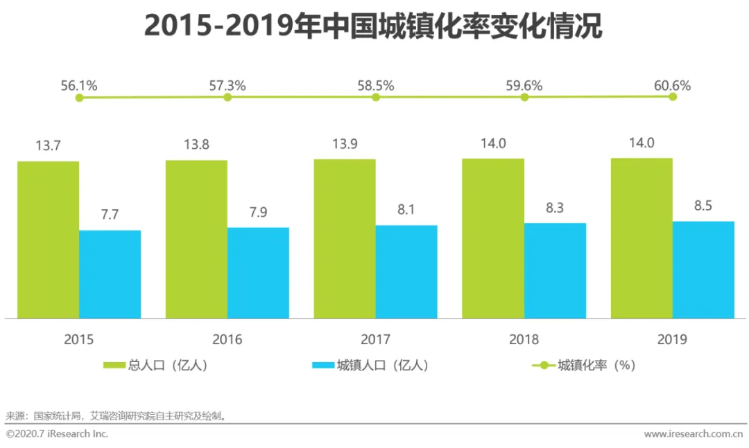 城镇化率的提升可有效驱动国家经济的健康有序发展。农村人口加速向城镇转移,不仅能够帮助释放消费潜力,还能随着生产生活方式的转变而扩大相关需求。纵观全球,发达国家的城镇化率一般较高,以美国、英国和日本为例,该三个国家的城镇化率在2015-2019年中稳定地保持在80%以上,其中,日本的城镇化率更是超过91%。2014年,中共中央、国务院印发《国家新型城镇化规划(2014-2020年)》,目标于2020年前将城镇化率提升至60%左右。2015-2019年间,我国城镇化进程稳步推进,城镇化率从56.1%提升至60.6%,提前完成国家目标,城镇人口于2019年已达到8.5亿。虽然对比起发达国家,我国的城镇化进程仍有较大的前进空间,但这也意味着我国在推进城镇化的路途中具有巨大的经济发展潜力。