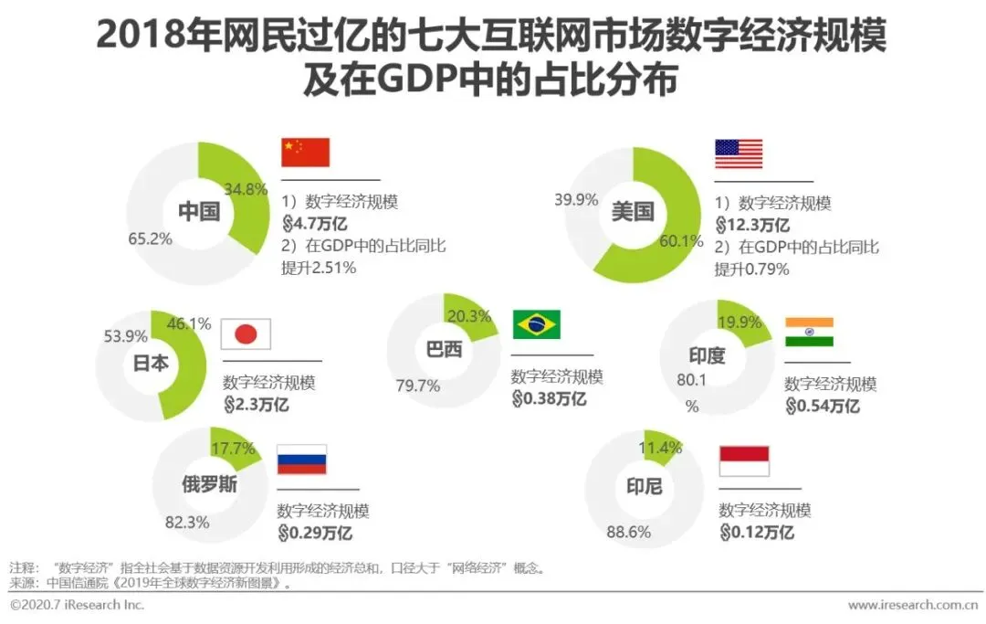 数字经济已成为国民经济的重要组成部分,放眼全球的数字经济发展情况,2018年,发达国家的数字经济规模为22.5万亿美元,在GDP中的占比达到50%,规模与占比皆远高于在GDP中占比25.7%、规模为7.7万亿美元的发展中国家。在互联网基础设施的完善与应用下,发展中国家在过去一年中的数字经济发展增速为12.9%,奋力追赶着同期增速8.0%的发达国家。具体到网民过亿的七大互联网市场来看,在技术能力支撑、国家政策支持等的推动下,美中日三国以较大优势领跑其余国家,其中,美日两发达国家的数字经济已发展到较高水平,对GDP的占比分别为60.1%与46.1%,而占比仅为三分之一,但增速是美国3倍的中国,则还拥有较大的数字经济发展空间。在未来,各产业的数字化转型、新基建的打造和政策的支持与监管,将成为各国数字经济发展的重要推力。