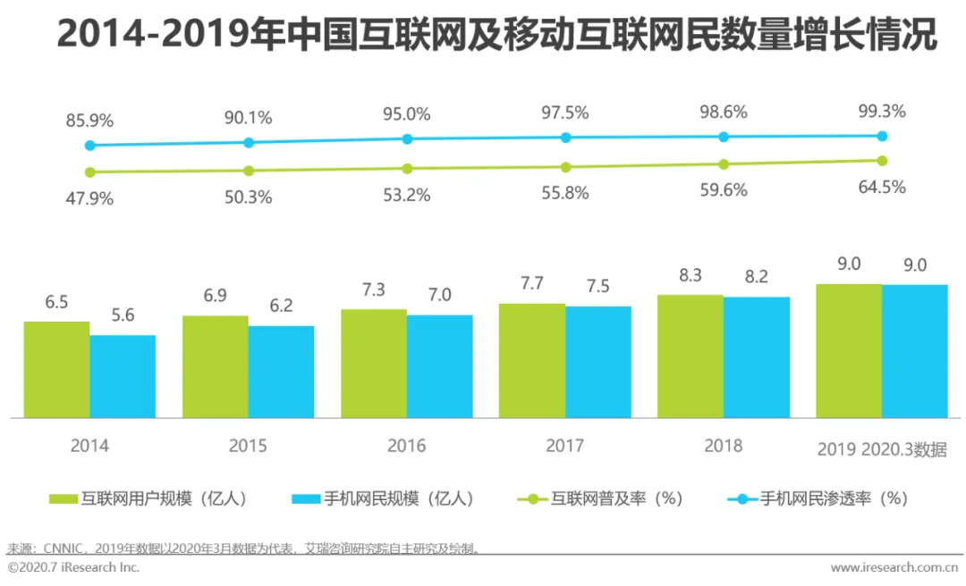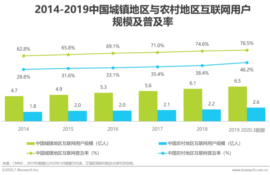 2020年3月,中国的互联网普及率达到64.5%,覆盖了近三分之二的国民,相较于2018年的普及率提升了4.9个百分点。而在整体网民中,手机网民的占比达到了99.3%,相较2018年年底数据提升0.7个百分点。近年来,我国农村地区的互联网普及率不断提升,从2014年年底到2020年3月,农村地区互联网用户规模增长了43.3%,比同期城镇地区互联网用户规模38.4%的增长高出4.9个百分点。农村互联网用户破2.6亿,普及率近半、增长迅速,成为未来互联网服务的新红利地区。