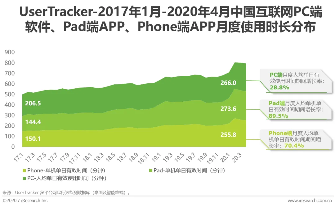 2020年4月,我国互联网用户对PC端软件、Pad端APP和Phone端APP的人均单日/单机单日有效使用时间分别为266.0分钟、273.6分钟和255.8分钟,相较于2017年1月的206.5分钟、144.4分钟和150.1分钟分别上涨28.8%、89.5%和70.4%。PC端软件的用户使用时间变化相对较小,但单个互联网用户对移动端上网设备的使用粘性大幅提升,个人对手机或平板电脑的注意力与时间的分配平均上升了2小时左右。在移动网络覆盖面不断扩大的推动下,更为便携的手机与平板电脑正在成为互联网用户日常获取信息等渠道。