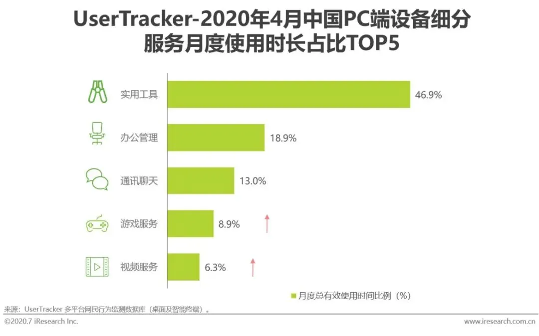 1)用户在PC端的软件使用以实用类为主,如输入法、浏览器和安全防护等的实用工具类别软件,以及效率办公、电子文档等的办公管理软件占PC端使用时间的65.8%;但同时,游戏服务和视频服务等偏娱乐性软件的使用时长占比合计同比提升超过3个百分点。