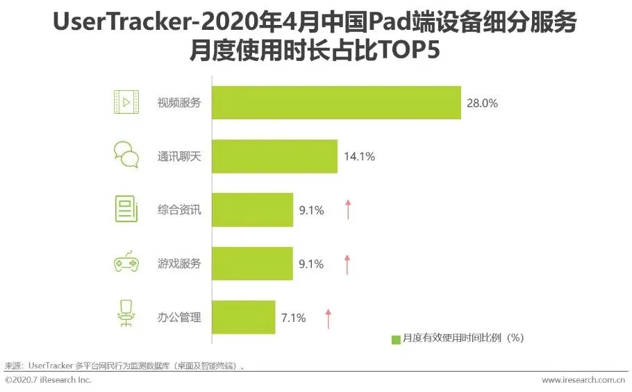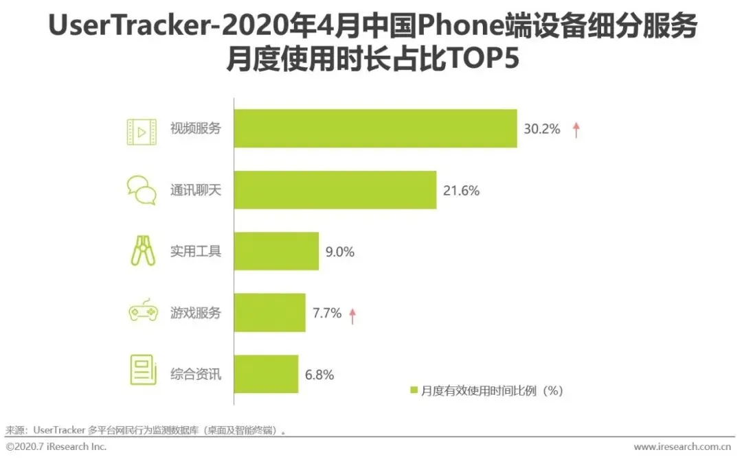 2020年初,受到新冠疫情的影响,不少企业选择延迟复工与居家办公,学校的开学时间也被推迟,居家时间的拉长,使得使用线上APP开展办公和教育的需求大幅提升,效率办公与儿童教育成为潜力服务APP类型。2020年4月,以钉钉、腾讯会议为代表的效率办公APP的月度有效设备数同比增长359.8%,从2019年4月的7323.9万台增长至33677.5万台,用户量激增。同时,以爱奇艺奇巴布、儿歌多多等为代表的儿童教育类型APP也在亲子陪伴时间与儿童居家时间共同提升的促进下,而同比增加了70.2%的独立设备数。另外,在度过用户量的快速增长期并获得高量级用户群后,短视频APP的用户增长也开始放缓,进入到成熟期。