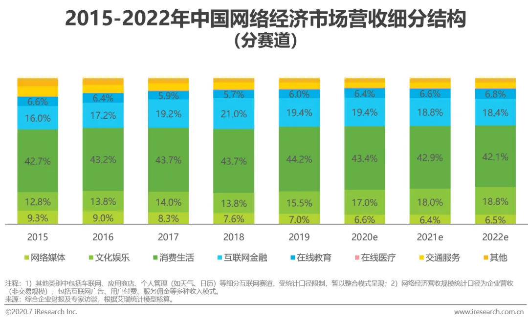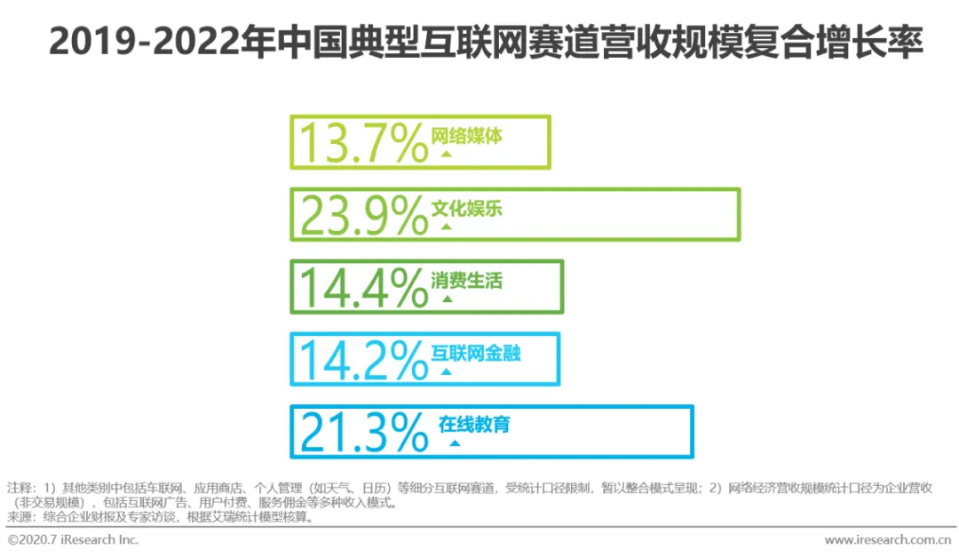 与2018年相比,网络经济市场中文化娱乐、消费生活、在线教育和在线医疗赛道的份额占比有所上升,分别增加1.74%、0.51%、0.32%和0.05%,增速领跑整体网络经济市场;而在2015-2018年中持续扩大占比的互联网金融赛道,则因暂未脱离“寒冬期”而呈现出较为明显的占比下滑。对于未来三年的发展情况,根据艾瑞推算,因在新冠疫情影响下而增强了消费者使用习惯的文化娱乐和在线教育将分别以23.9%和21.3%的复合增长率持续增长,成为未来三年中稳定扩大市场占比的两个赛道。