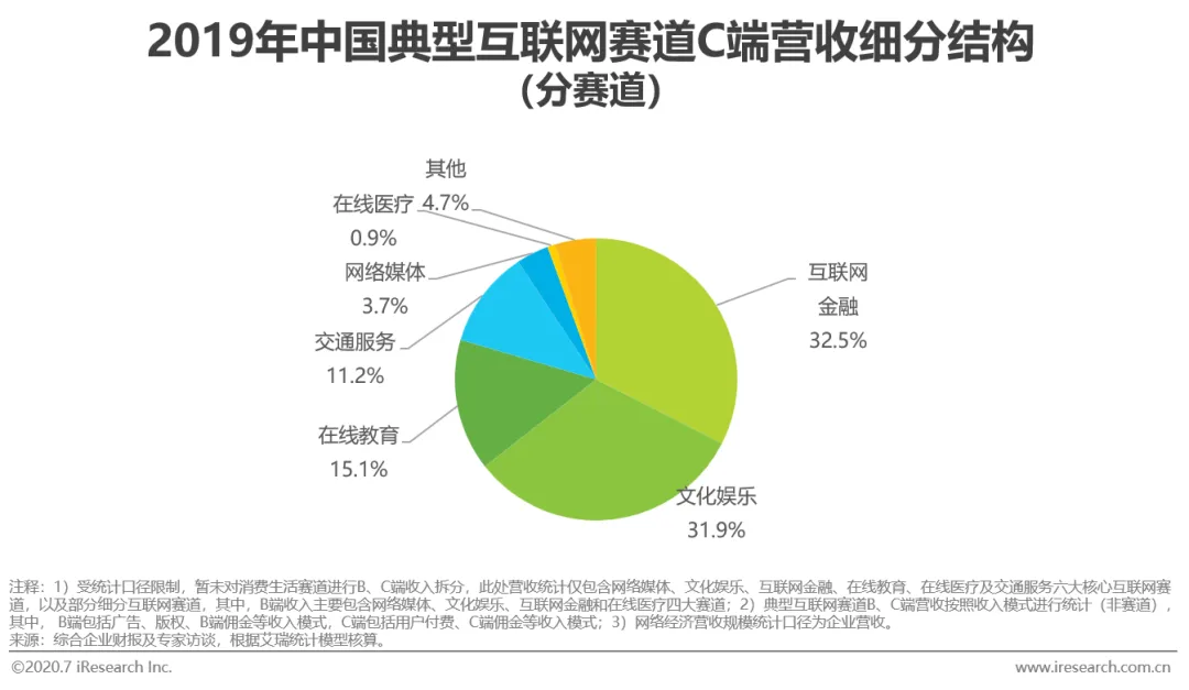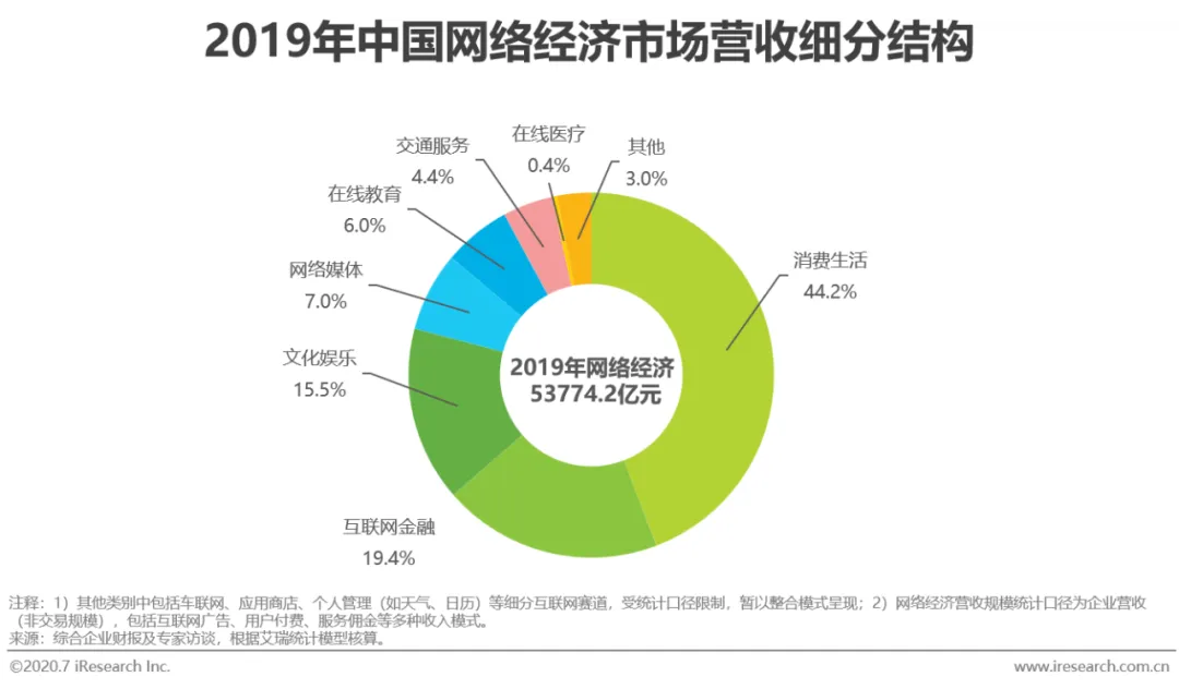 典型赛道:与2018年相比,2019年网络经济市场中文化娱乐、消费生活、在线教育和在线医疗赛道的份额占比有所上升,规模分别达到8341.1亿元、23479.8亿元、3225.7亿元与238.7亿元。而在2015-2018年中持续扩大占比的互联网金融赛道,则因暂未脱离“寒冬期”而呈现出较为明显的占比下滑,规模达到10441.2亿元,同比增速仅为12.0%。