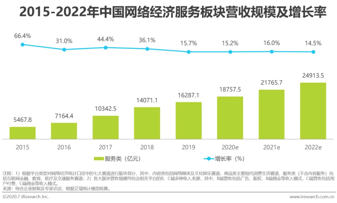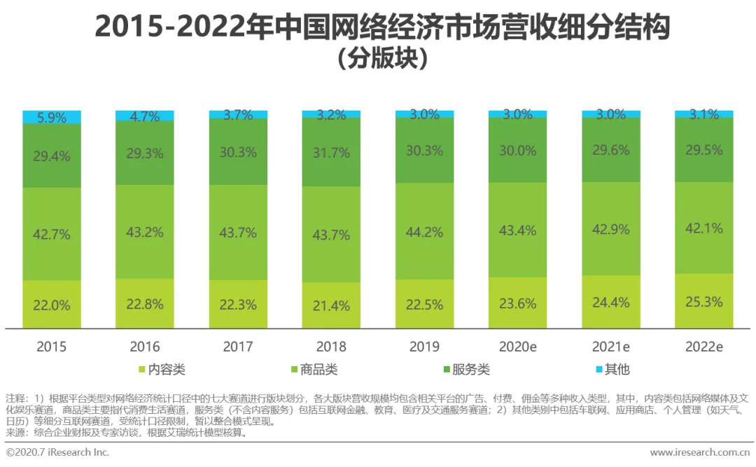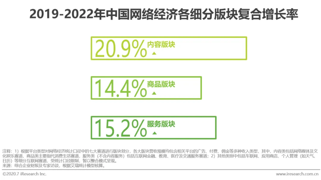 在2015-2018年间,构成网络经济营收的三大版块份额占较为稳定,其中,商品版块和服务版块的占比缓慢增长,而内容版块占比相对有所下降。2019年,在短视频、直播、电子竞技、在线音频等内容版块领域的快速增长带动下,相较于发展态势平稳的商品版块和受累于互金行业管制的服务版块,内容版块开始向上发展。内容、商品和服务版块在2019年的份额占比分别为22.5%、44.2%和30.3%,同时,内容版块的占比由降转增,并预计在2019-2022年间将以20.9%的、超过其余两个主要版块的年复合增长率快速增长,到2022年将相对2018年的占比增长近4个百分点。
