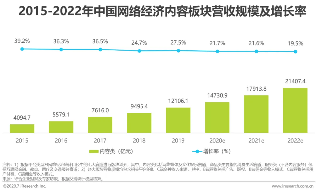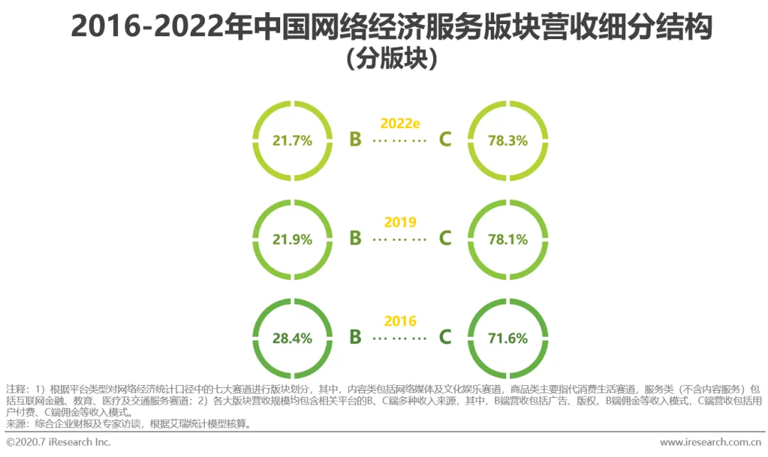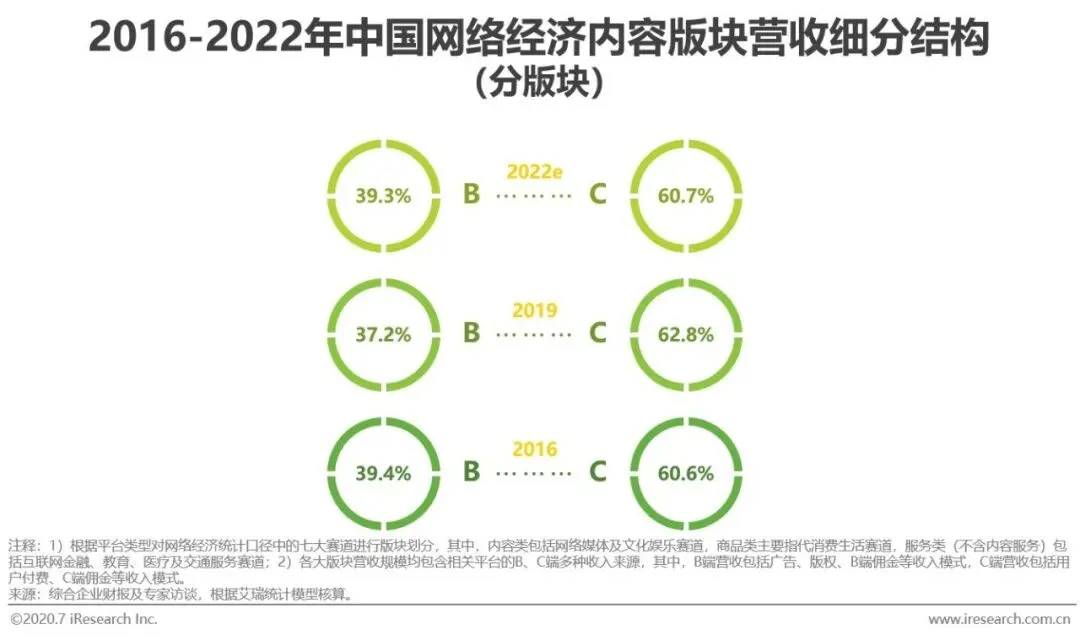 2018年,因移动端游戏用户规模骤跌,使得移动游戏的收入增速大幅下降;同时,2018年期间游戏版号停发,也拉低了电脑客户端游戏等的收入。2019年,在版号停发的“寒冬期”结束、移动游戏用户增速回弹、用户对直播打赏意愿的加强、数字阅读的版权运营收入加速提升等的背景下,内容版块的营收规模增速再度提升。从商业模式角度来看,2019年,在用户内容付费与直播打赏意愿加强、对电竞和网络游戏娱乐需求增加的背景下,网络经济内容版块依靠C端获得的收入相比2016年提升了2.2个百分点;而在未来,随着广告主跟随消费者使用习惯而加大对短视频、社交、音频和漫画等的广告投入,内容版块的营收构成也将会向B端倾斜,预估在2022年,内容版块将有39.3%的收入来自B端。