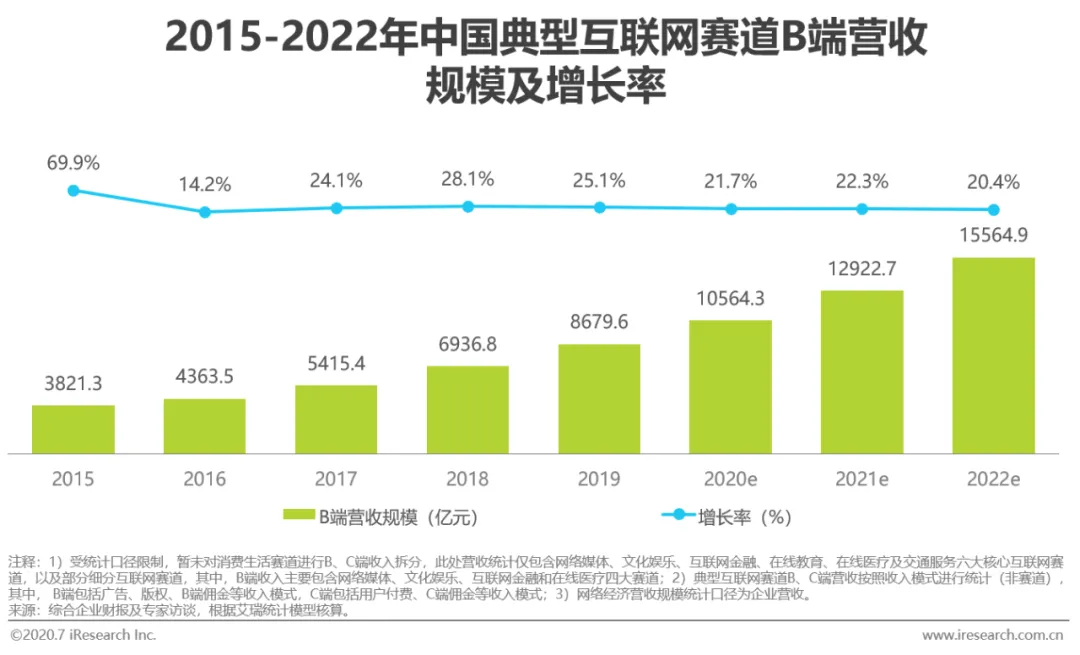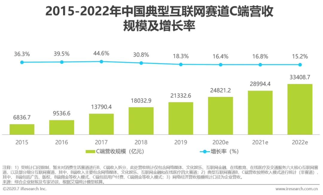 自2019开始,来自C端的典型互联网赛道营收规模的增速开始由30%以上的高增长率下降到18.3%,并于2019年实现21332.6亿元的收入。C端营收增速的下滑主要是因为: