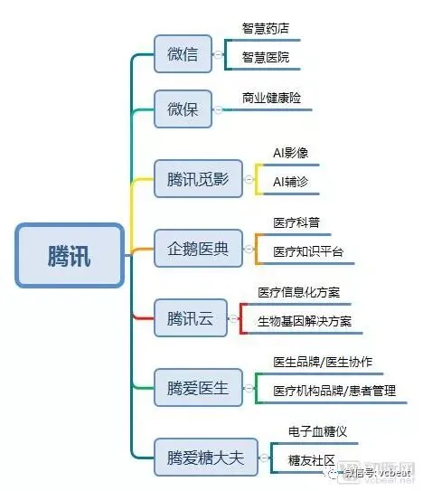 我们把腾讯、阿里在医疗领域的布局分为“自有”和“投资”两部分,我们先来看腾讯在医疗领域的布局,“自有”部分包括微信、微保、腾讯觅影、企鹅医典、腾讯云、腾爱医生、腾爱糖大夫。