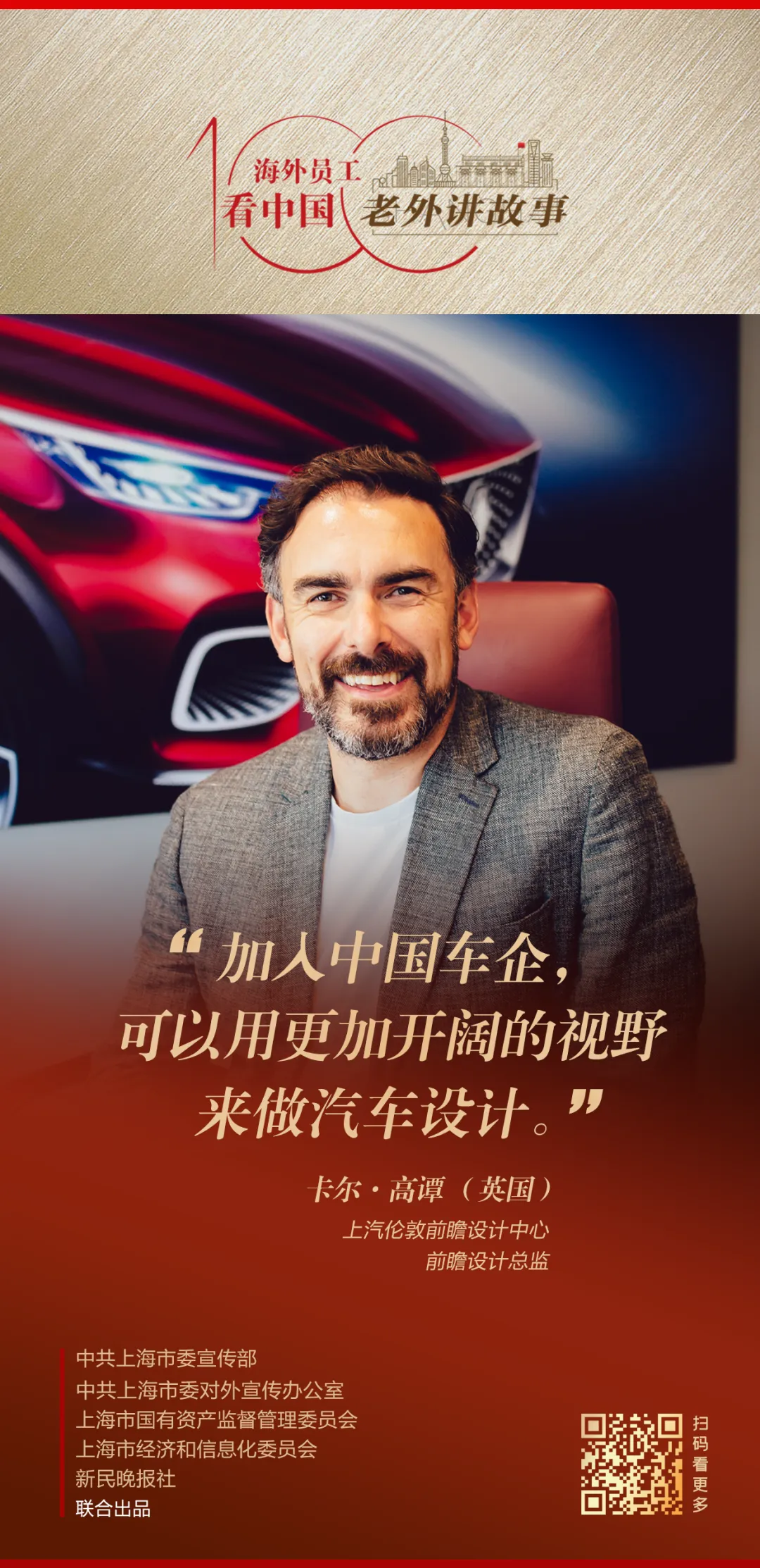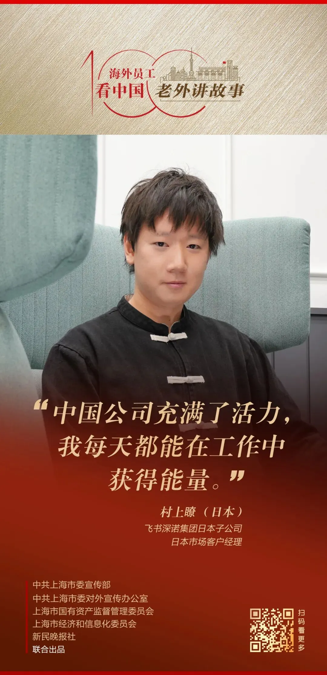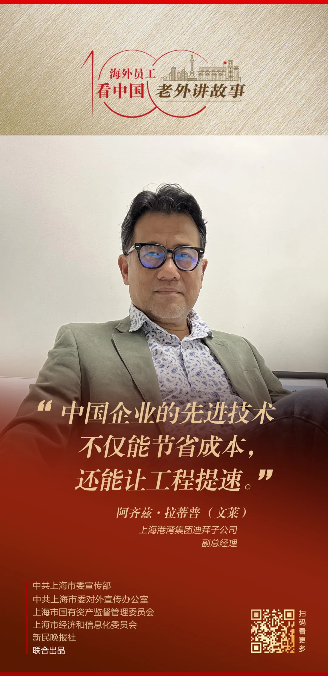 由中共上海市委宣传部、中共上海市委对外宣传办公室、上海市国有资产监督管理委员会、上海市经济和信息化委员会、新民晚报社联合出品的《老外讲故事•海外员工看中国》百集融媒体产品最新推出80-83期内容,印尼经贸合作区青山园区开发有限公司安全监察部副经理闫森、上汽伦敦前瞻设计中心前瞻设计总监卡尔·高谭、飞书深诺集团日本子公司日本市场客户经理村上瞭、上海港湾集团迪拜子公司副总经理阿齐兹·拉蒂普讲述自己身处中国企业、观察中国的真实感受。详见↓