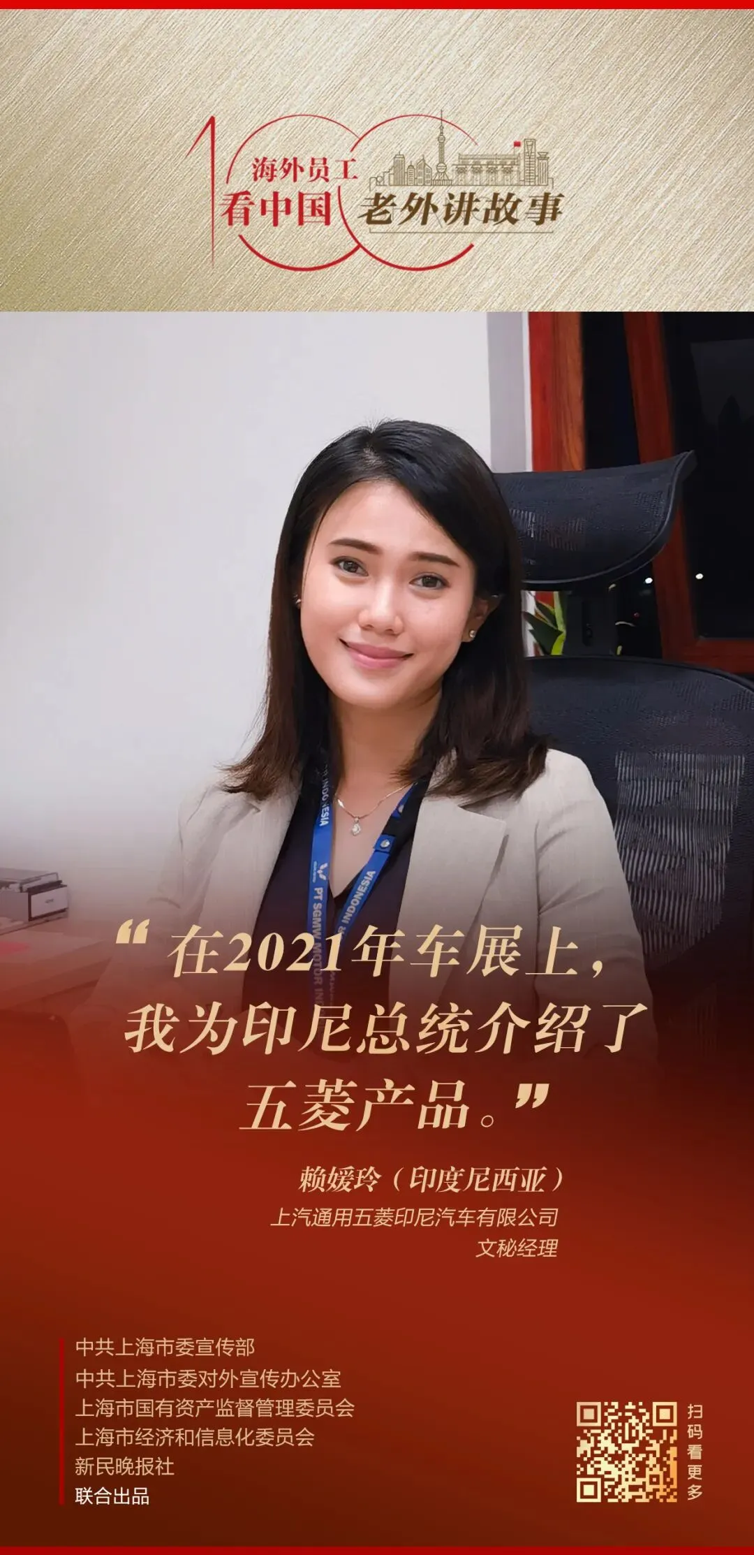 作为一名印尼华裔,赖媛玲2016年大学毕业后,加入了上汽通用五菱印尼汽车有限公司,负责文秘及相关行政工作。在这6年间,她见证了中国制造为印尼人民带来了许多与众不同的产品,深感自豪。她喜欢用中文唱歌,喜欢上海体现出的古老与现代交融之美,喜欢自己所在的公司生产的各种受人们欢迎的汽车。