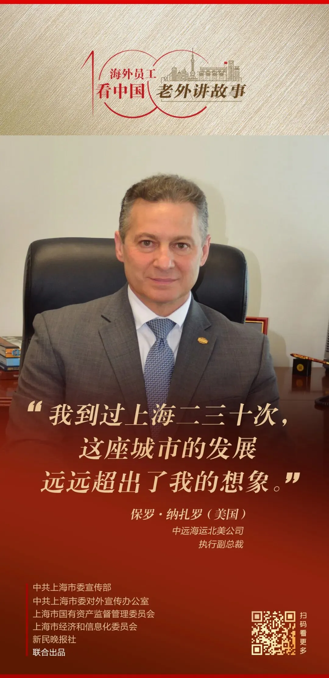 今年56岁的美国人保罗·纳扎罗(Paul Nazzaro)加入中远海运北美公司已有22年,“我很自豪能够成为中远海运的一员,大家紧紧团结在一起,我们的管理队伍在人员结构上要远胜我们的竞争对手,放眼如今美国的航运业,我们公司也是非常优秀、远胜同行的”。刚加入中国公司时,保罗感受到中美公司在企业文化上有非常明显的区别,表现在决策过程、风险管控、交流方式等方面,“但我们很快就意识到,两种文化之间的共性大于差异,我们有共同的目标需要实现,只是实现的方式可能略有区别。我们还意识到,在很多方面我们是能达成共识的,比如我们彼此认可对方的想法和价值观,因此我们最终能够融合两种不同的文化,发挥多样性的优势,创造出新的商业思维和管理模式。事实证明,这种做法让我们公司发展得很好”。保罗第一次来中国是在2002年,到了上海,“我记得当时我住在外滩的一家精品酒店,眺望着黄浦江对岸的浦东新区,想象着5年、10年和15年后上海会是什么样子。”从那以后,保罗已到过上海二三十次,“每次我都惊讶地发现,上海的发展远远超出了我的想象。”除了上海,保罗也造访过中国的各大港口城市,北到大连,南到深圳,“我每到一个城市都注意到当地的文化、地形、气候和饮食的多样性,但有一个共同点是当地同事的热情款待,通过这些商务旅行以及我在日常工作中积累的关系,我有幸与中国同事建立了珍贵的友谊。”编辑:姜晨