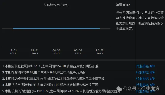 与2022年四季报相比,2023年四季报,紫金矿业运营能力维持稳定。其中,可持续经营能力加倍增强,现金满足投资的水平基本稳定。